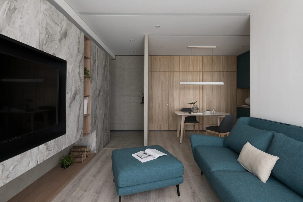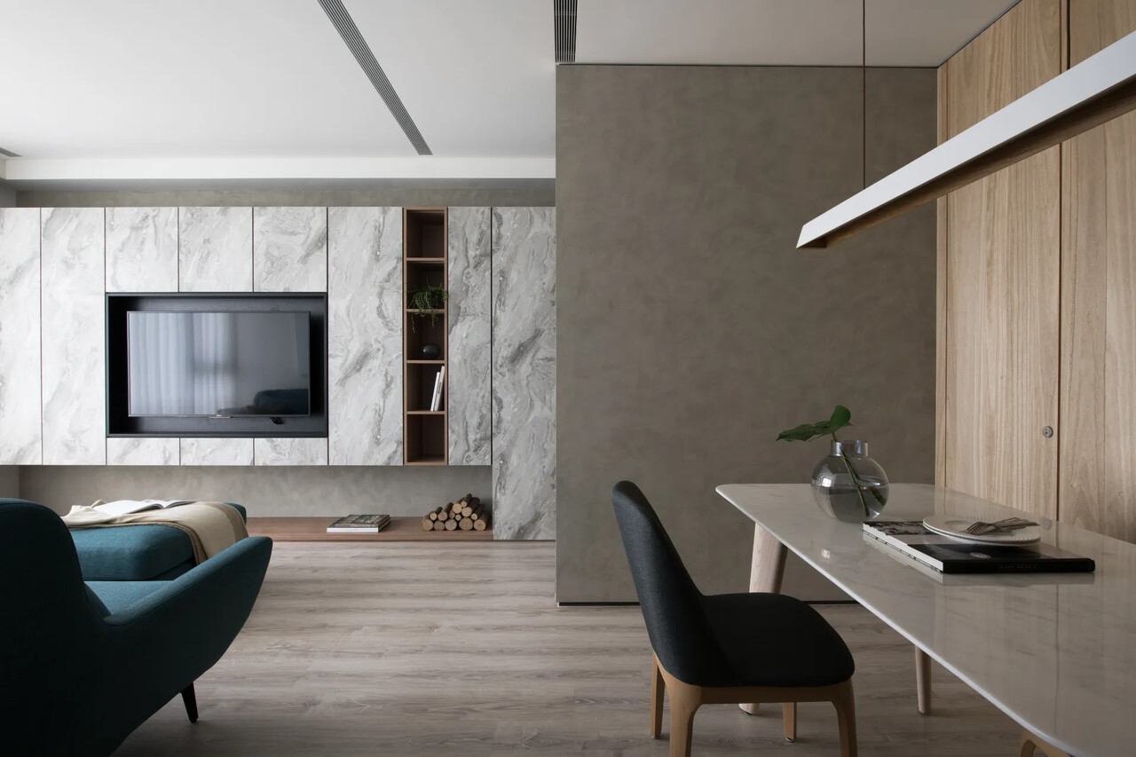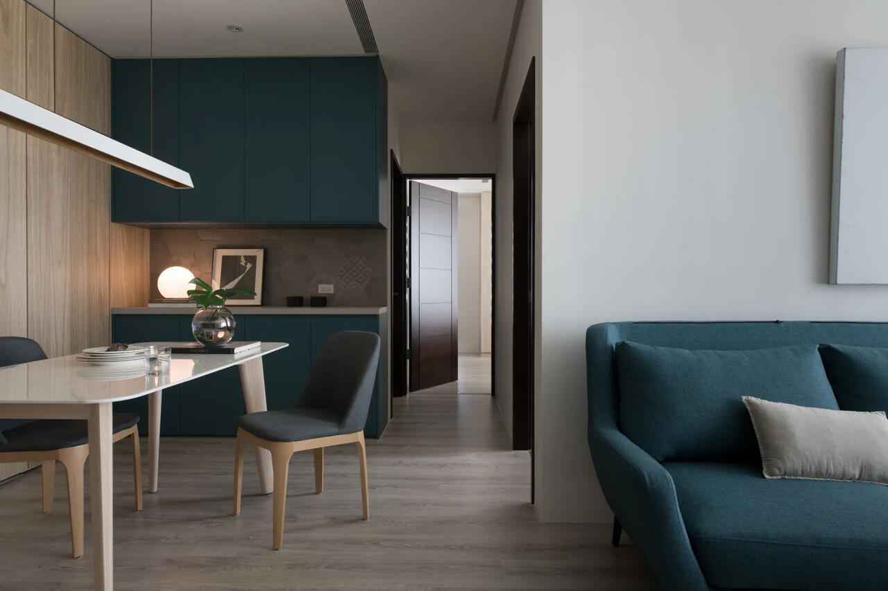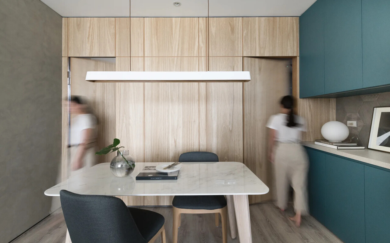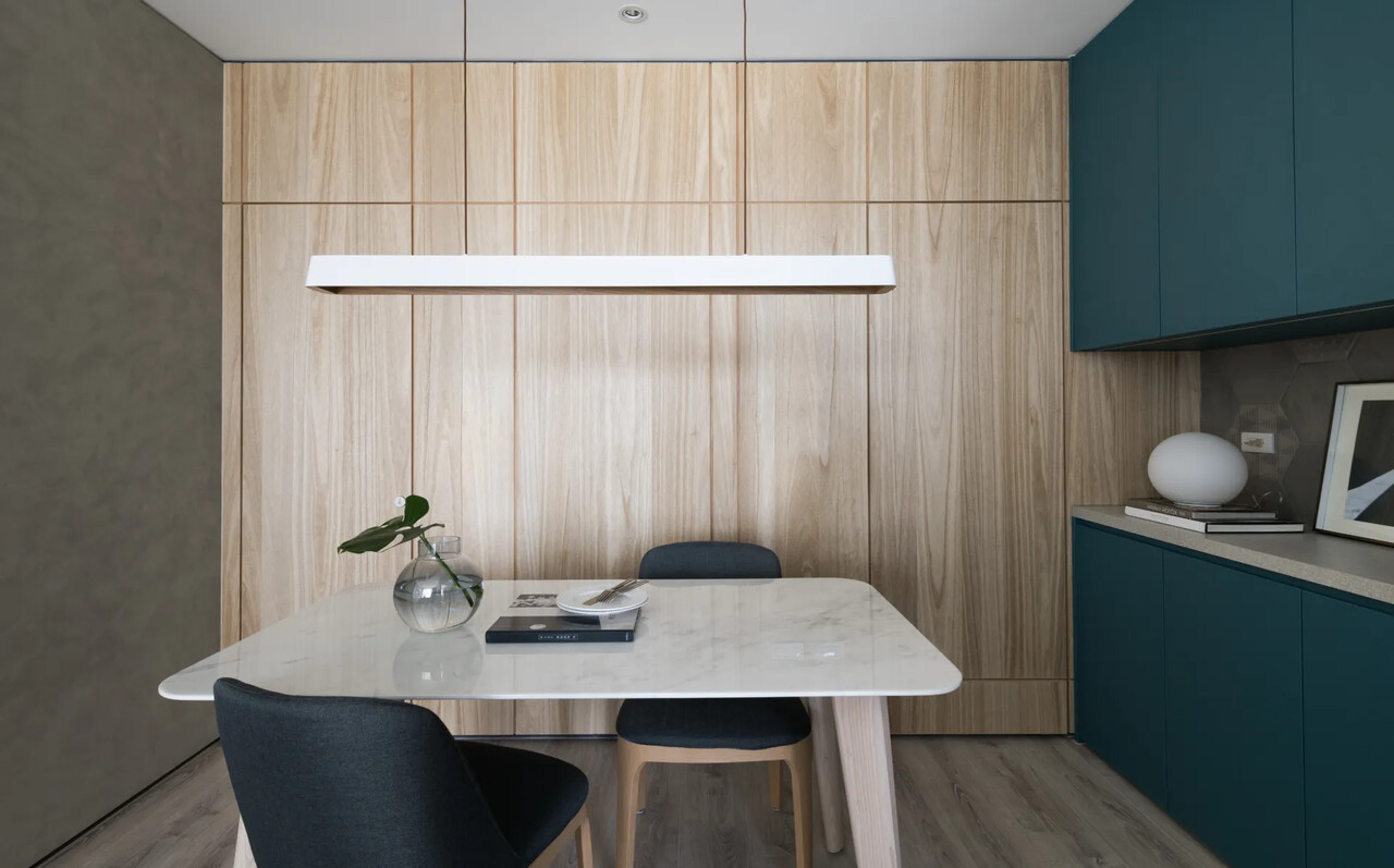 另一方面將廁所與廚房門片巧妙地隱藏起來,讓餐廳的空間感更安定,並且達到屋主長輩對風水細節的要求。