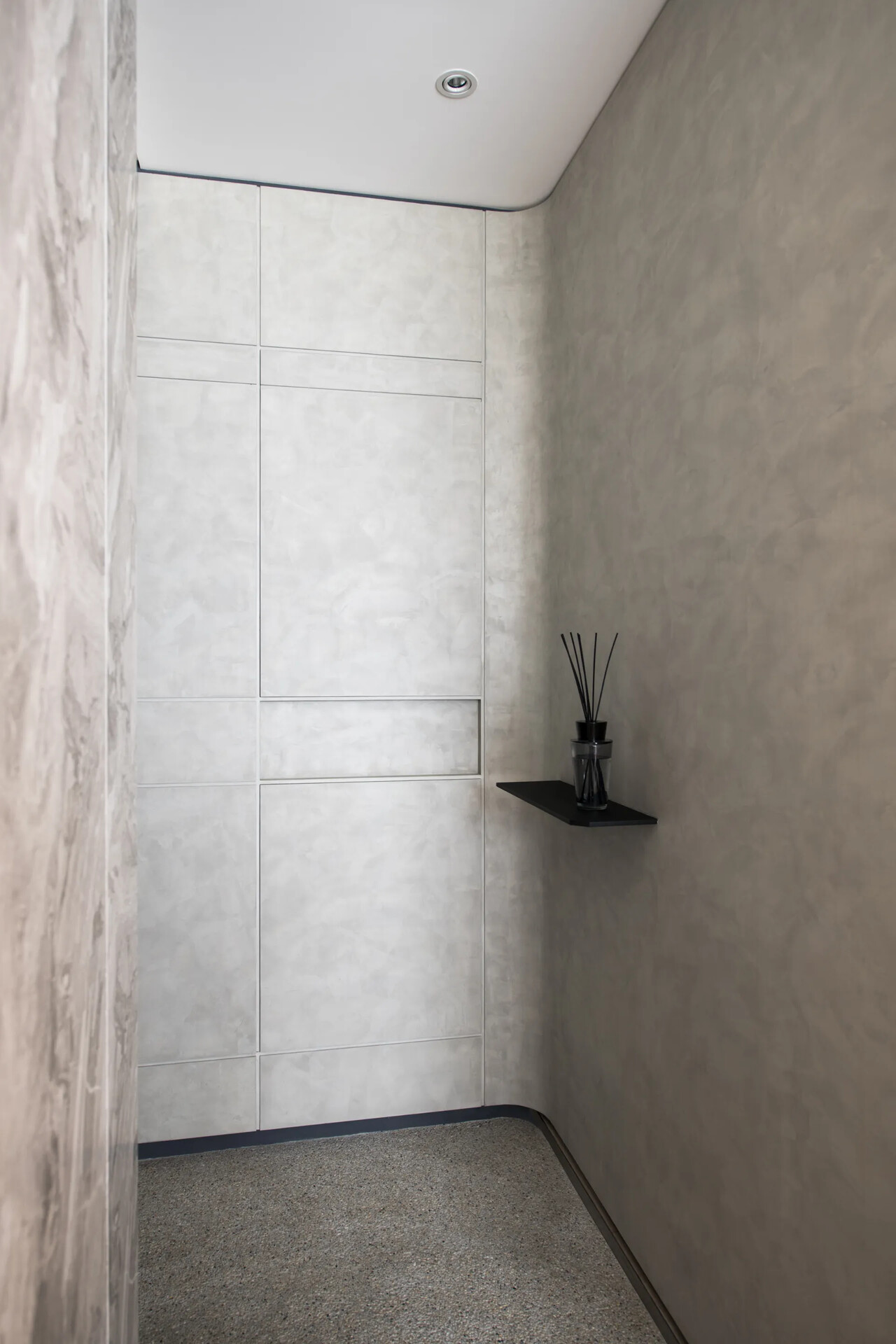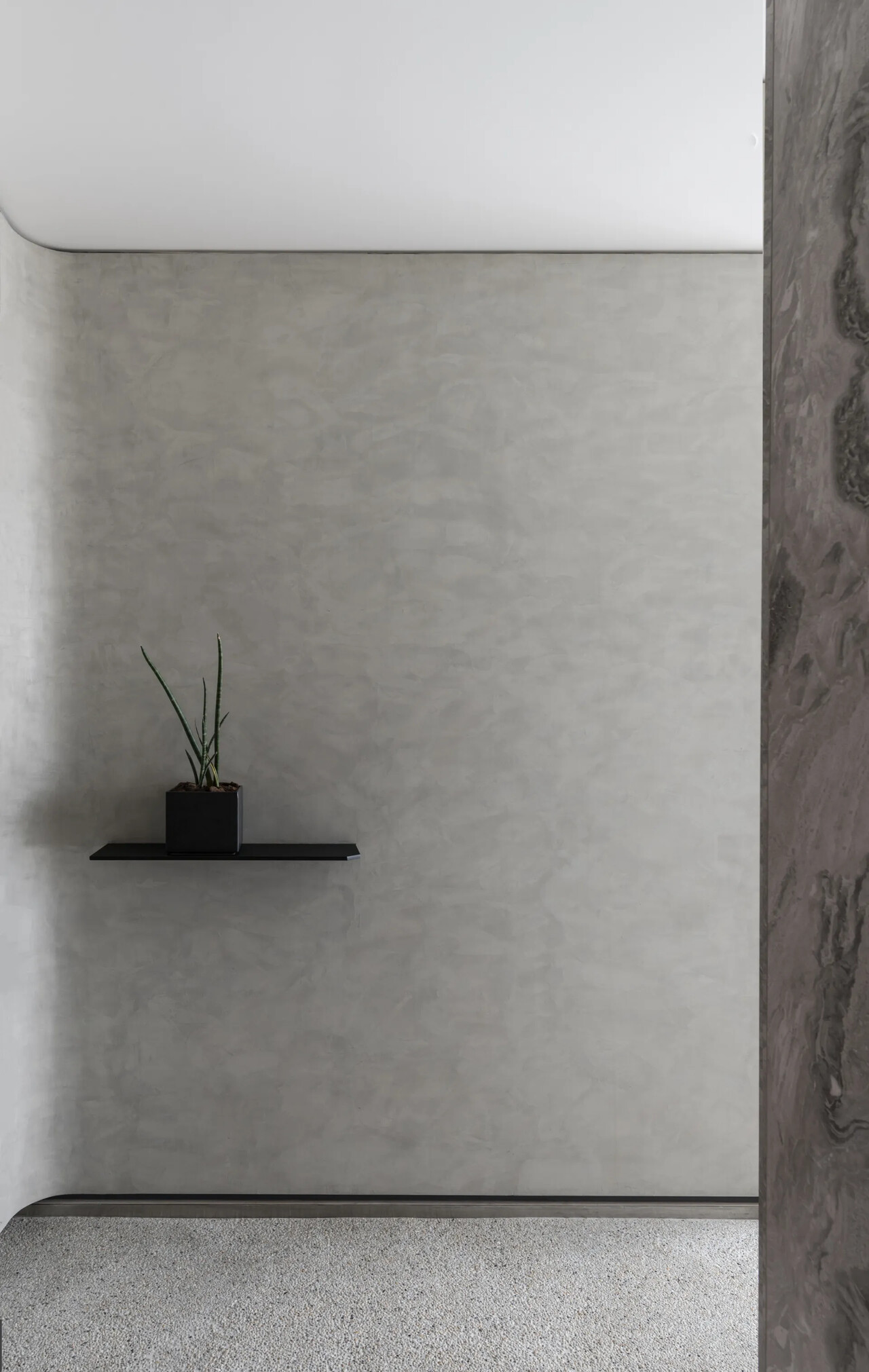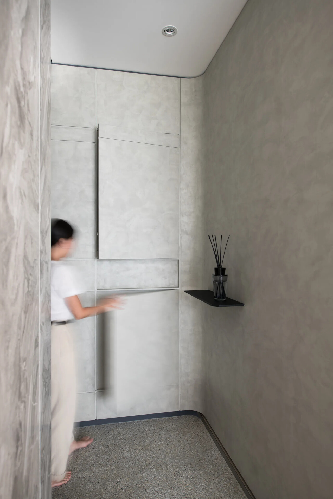 左側牆面以線性分割將玄關的兩組開關箱隱藏起來,正面留白,僅嵌入一片黑鐵置物層板,搭配樂土本身的材料質感,
