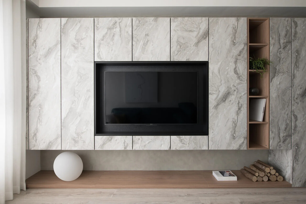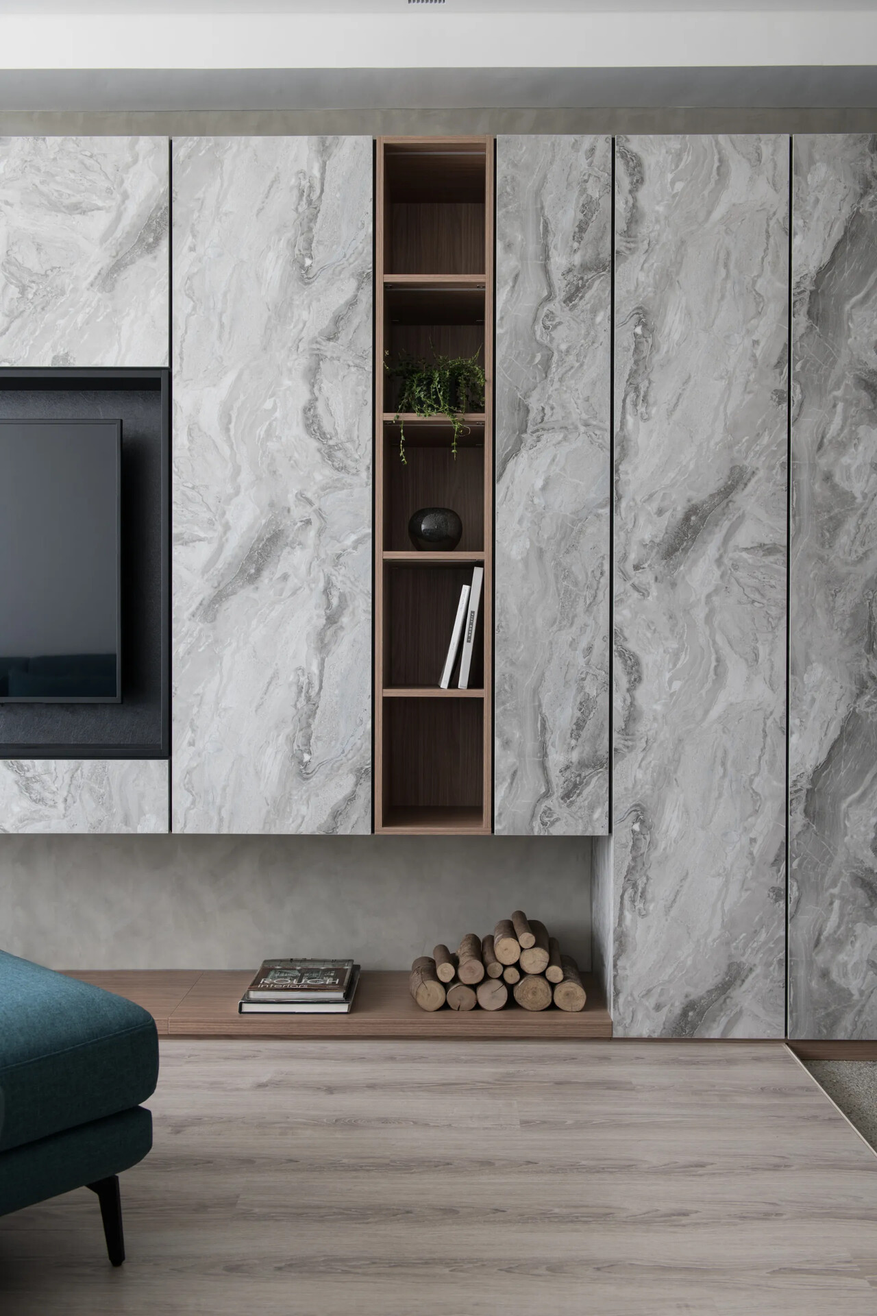 背牆設計分割溝縫,一方面消化單片木皮板尺寸長度不足的問題;