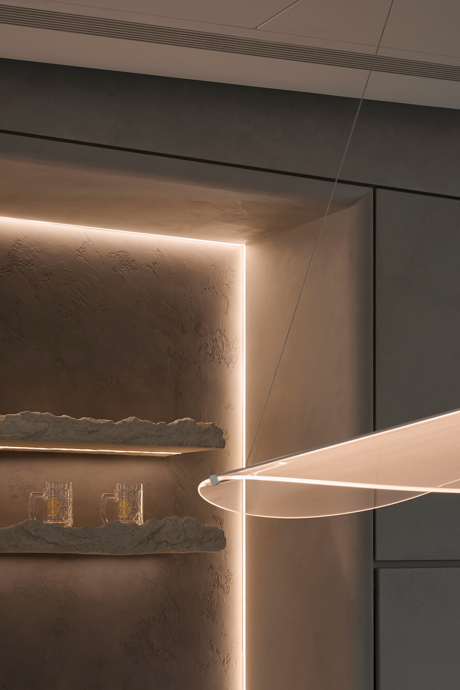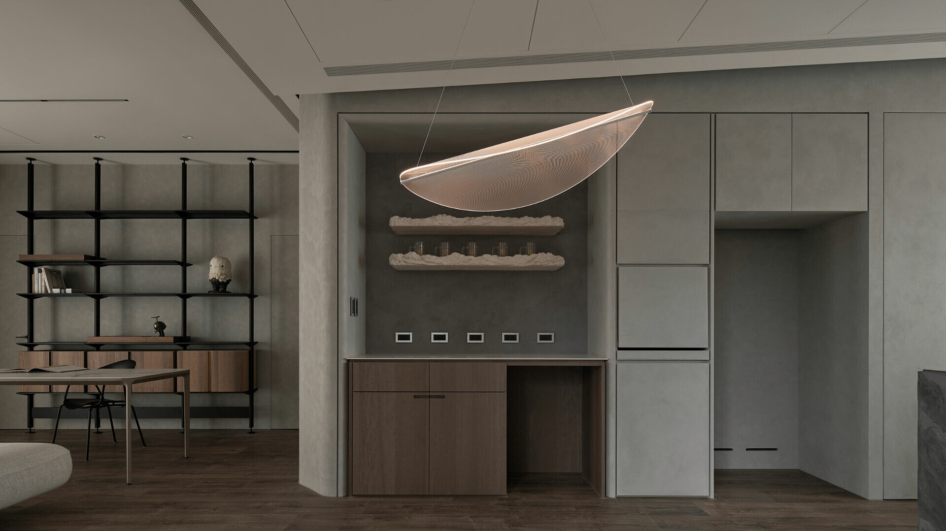 推襯光線成為最重要的主角 - 不是被耀眼強調,而是以「滲透」的方式存在 —沿著天花弧度、沿著牆面肌理緩緩推展,如同雨後雲層將啟之際,那抹再度回歸日常的光。