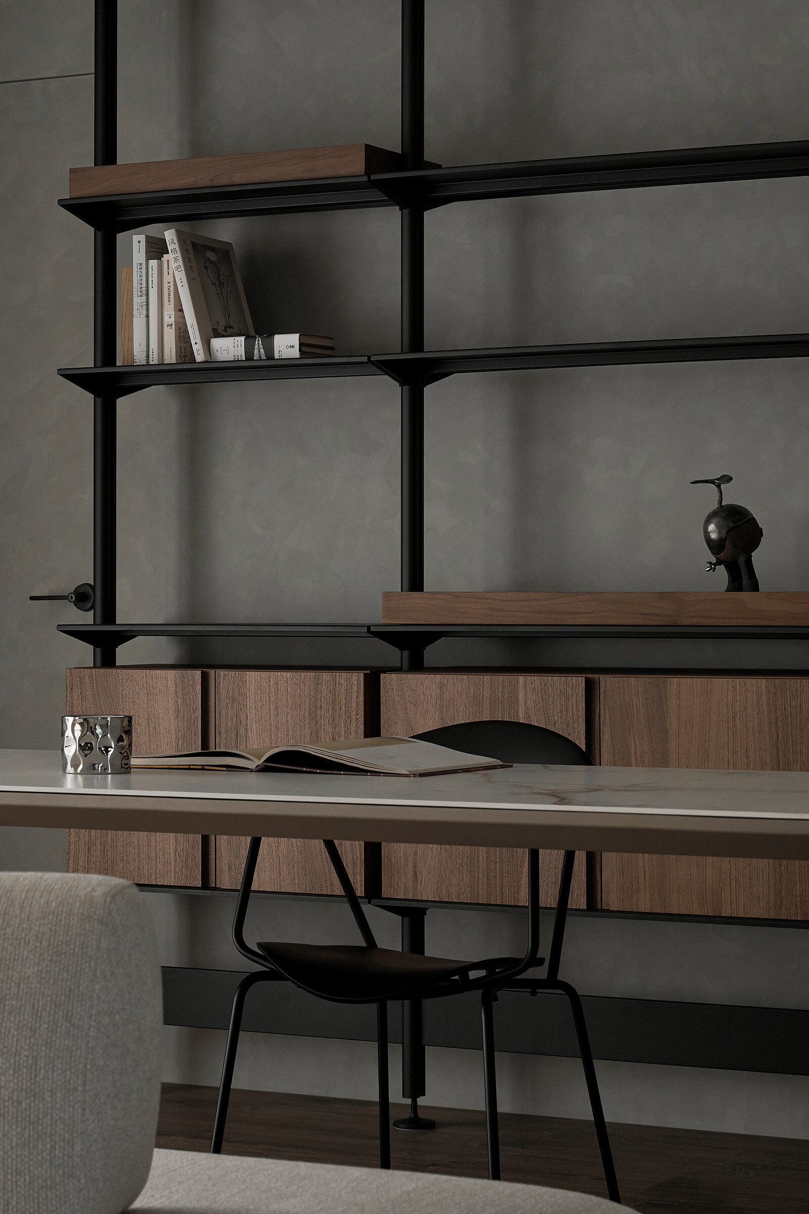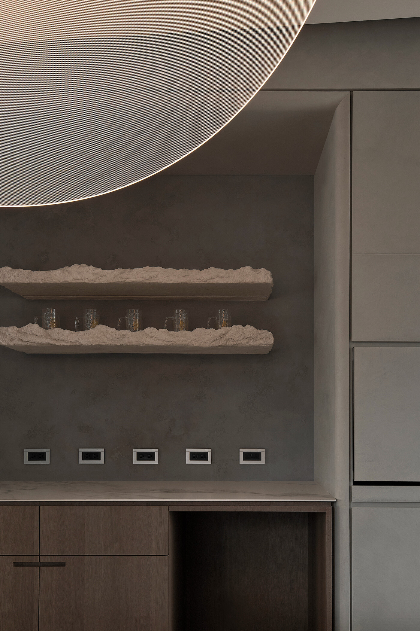 大量礦物塗料、細膩的灰階、木質層次,粗獷石皮紋理與平滑漆面的對比,形成安靜卻有深度的背景,