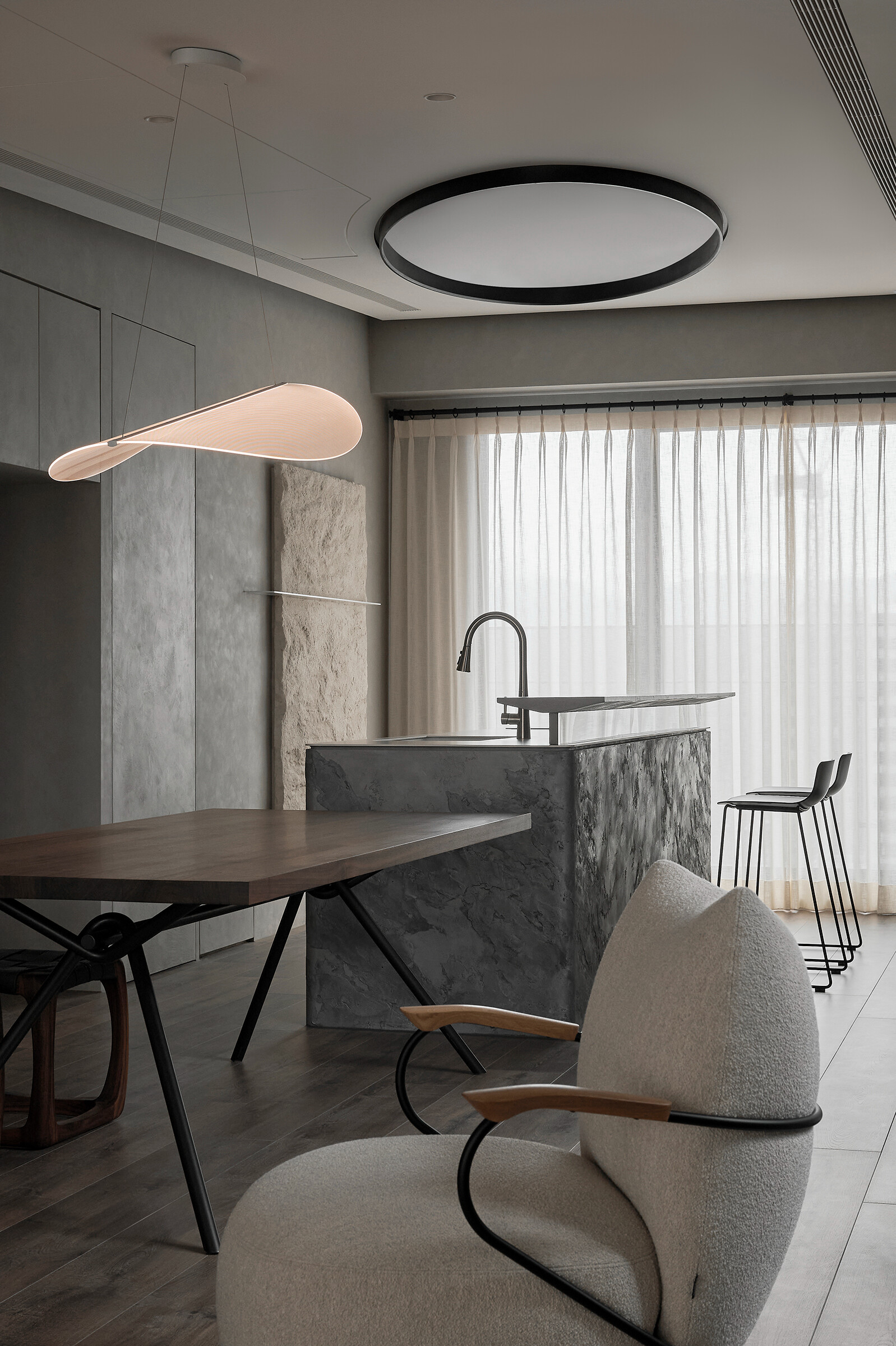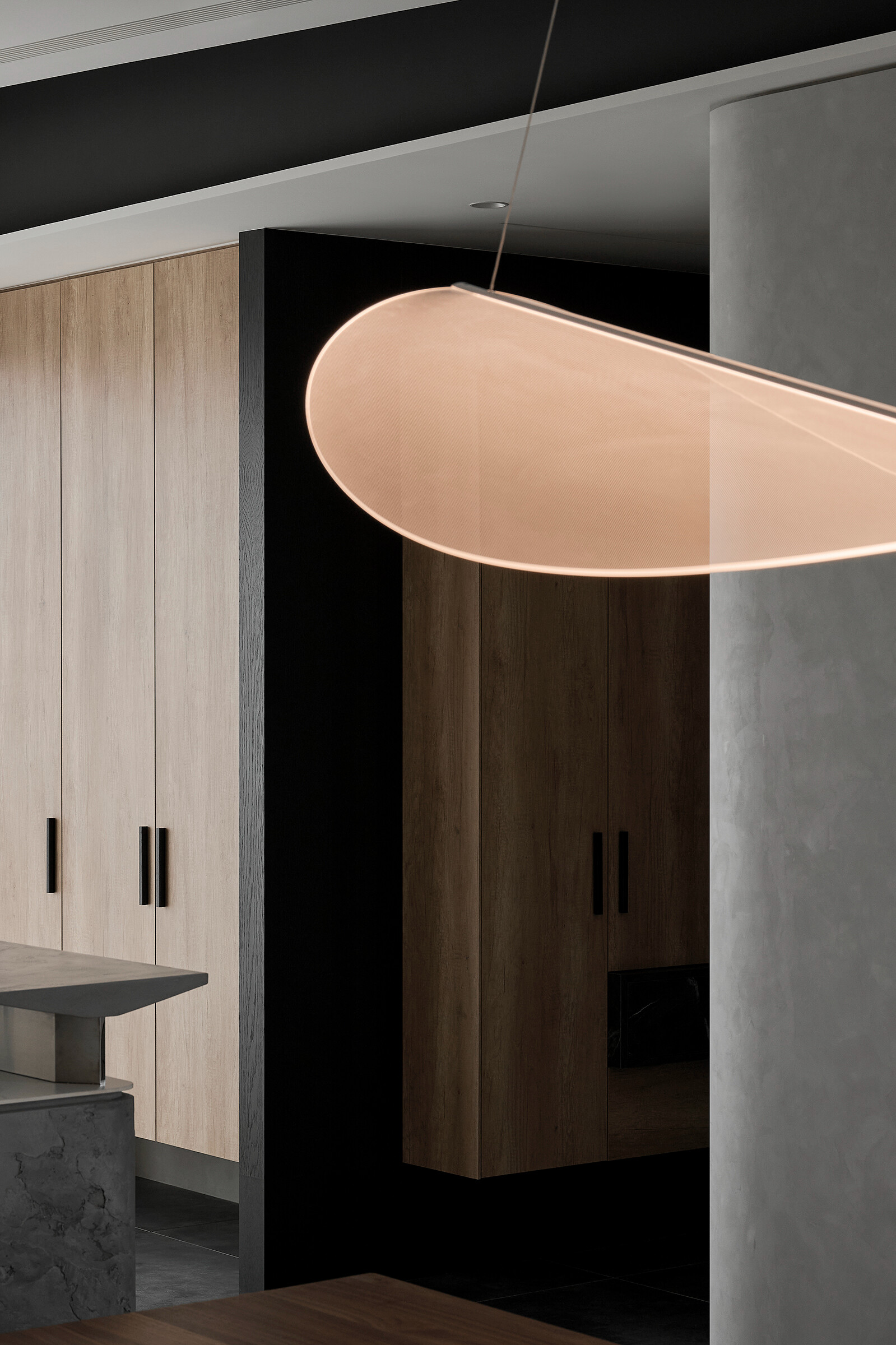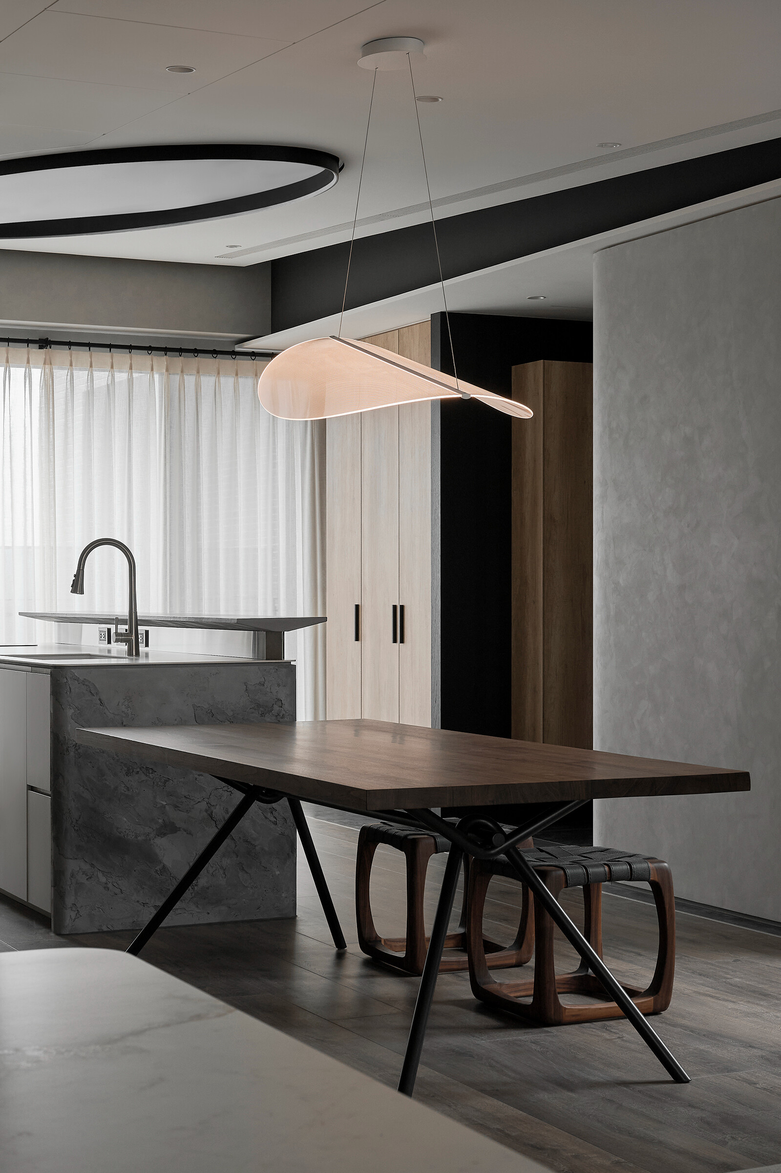 光膜設計提供工作區均勻充足的照明,餐桌上輕盈如蟬翼的吊燈,與溫潤木質平衡視覺感受的溫度。