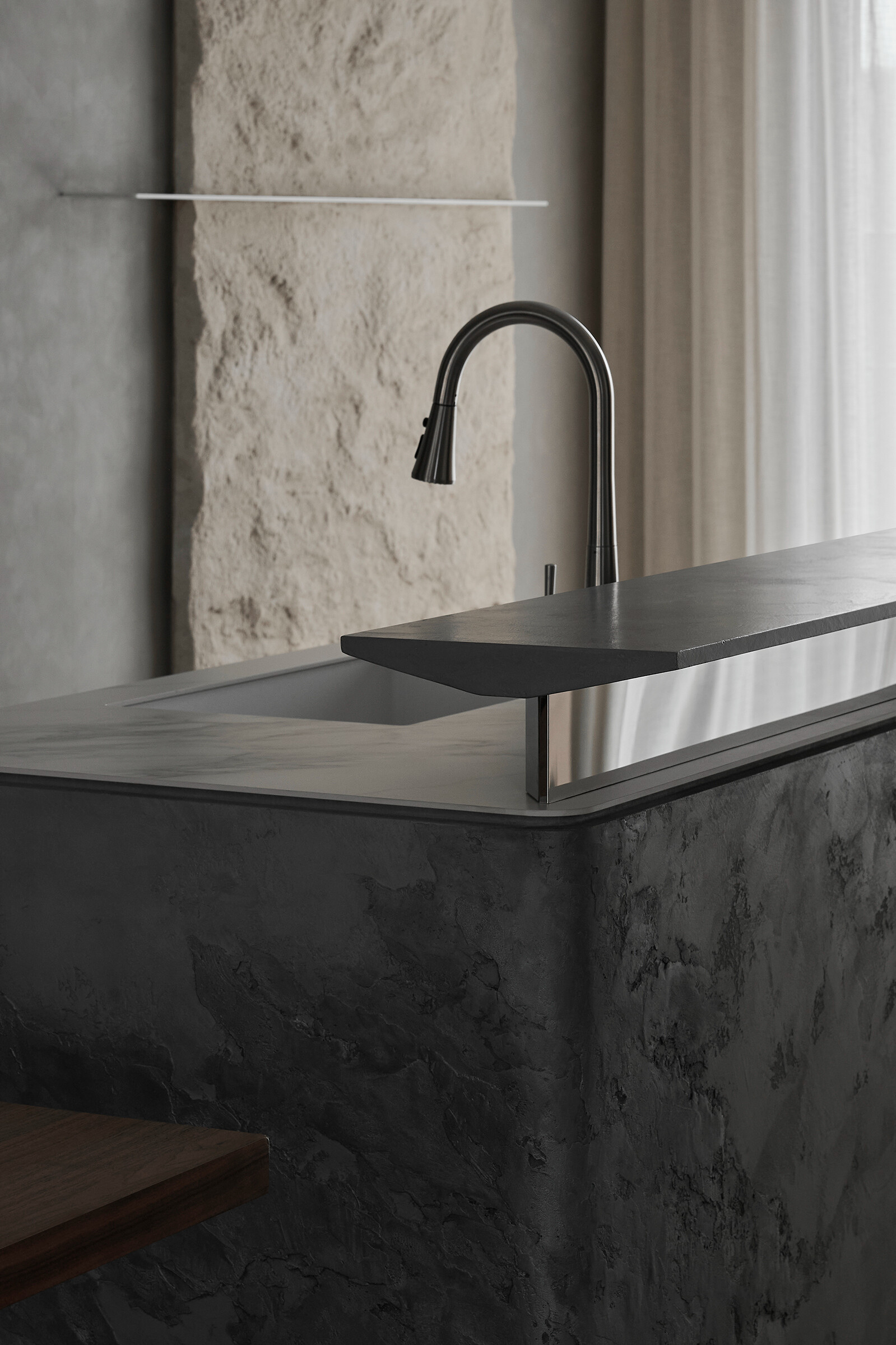 中島則是結合工藝與美學展現材料張力,利用木作與鏡面不鏽鋼打造出「飄浮」的極薄頸部,產生了視覺矛盾的趣味,使沉穩石紋平台彷彿懸浮於檯面之上的張力。