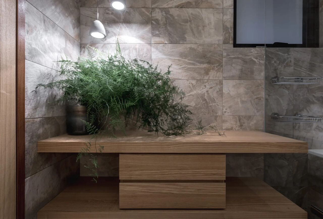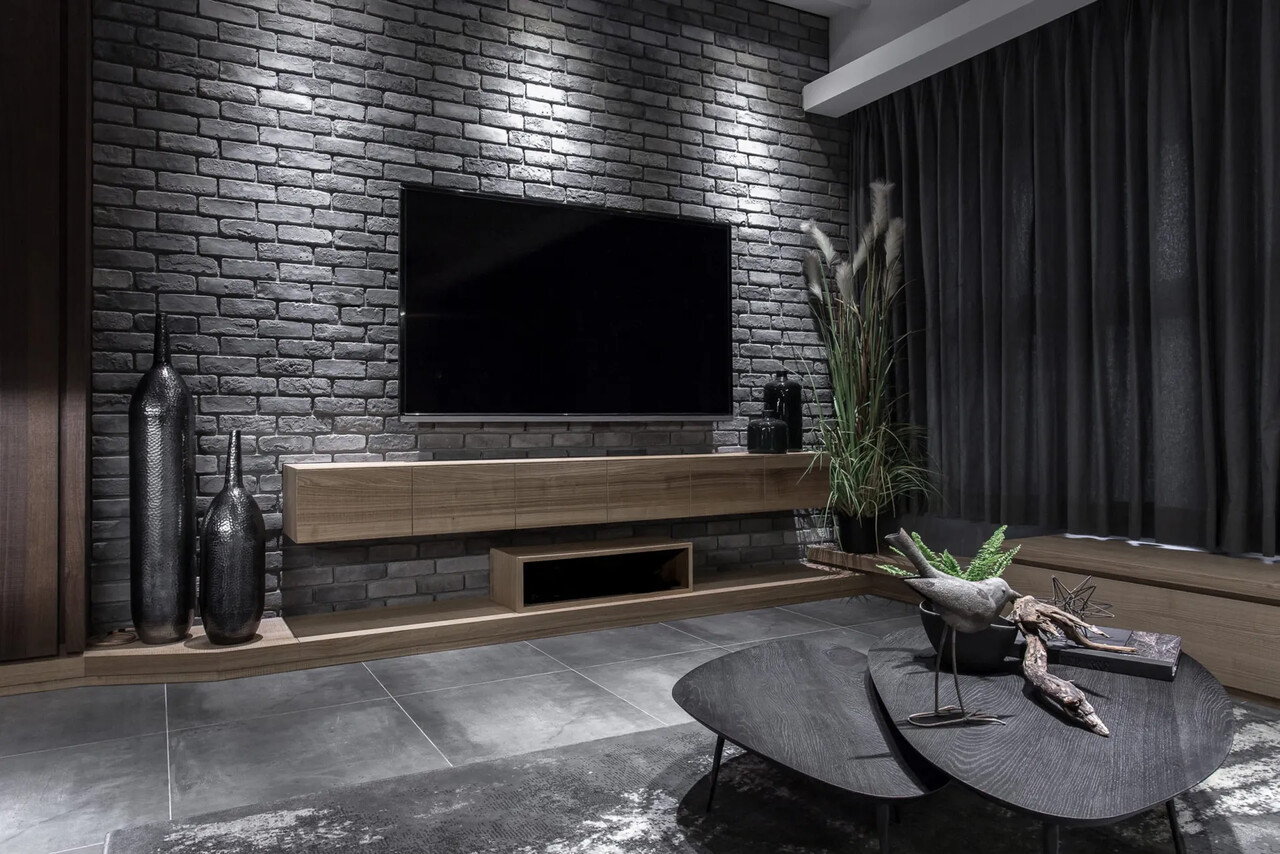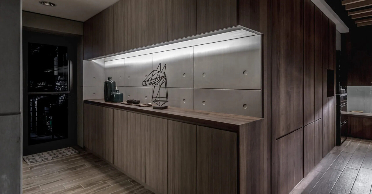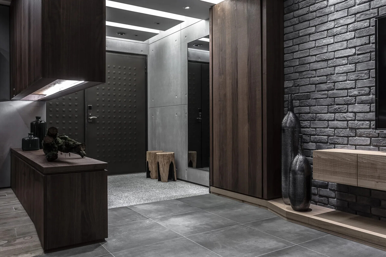 玄關的鞋櫃中間鏤空脫開,讓視覺穿透性放大了空間感;