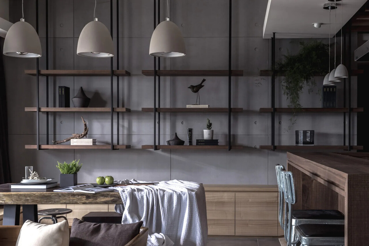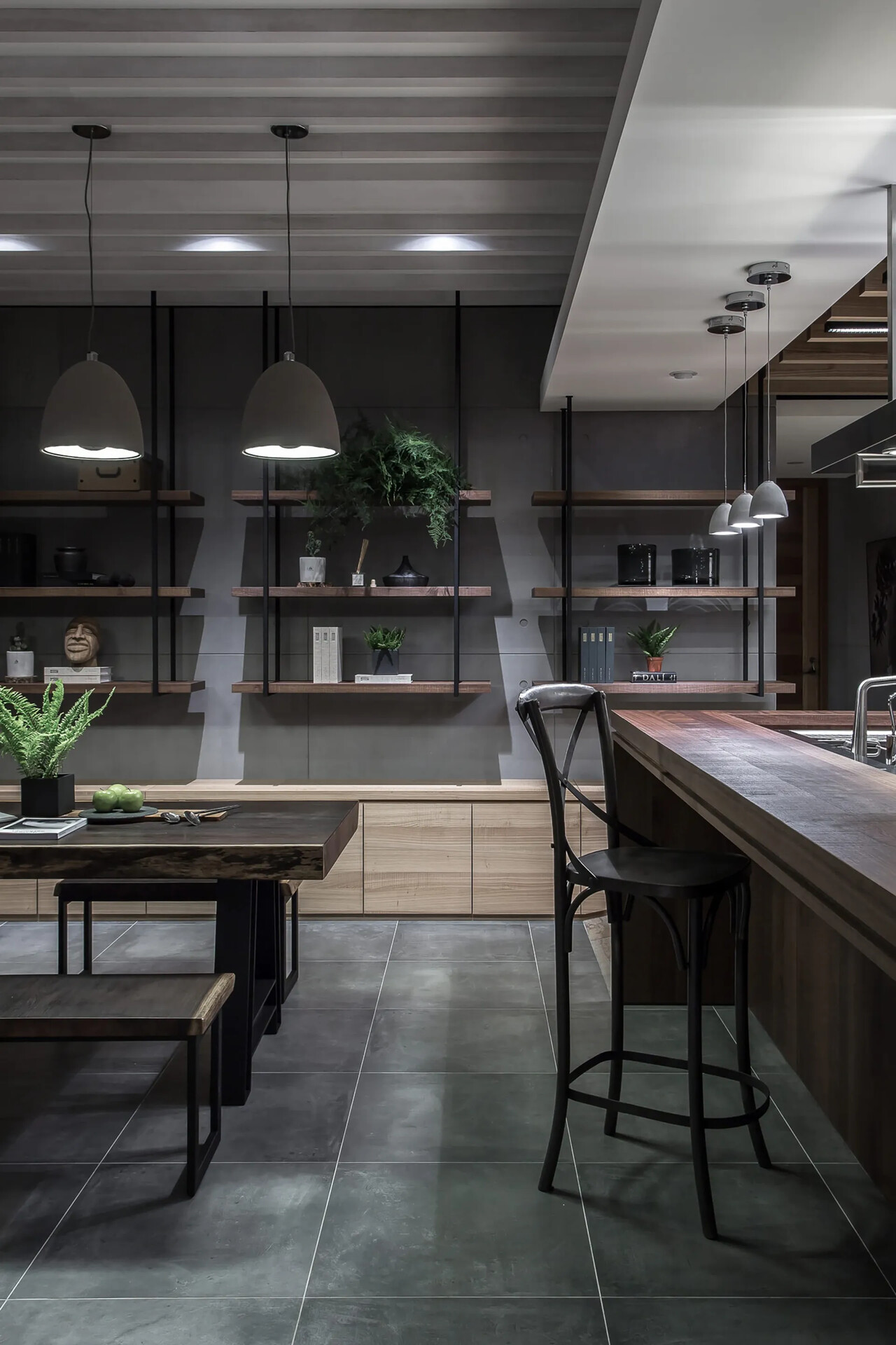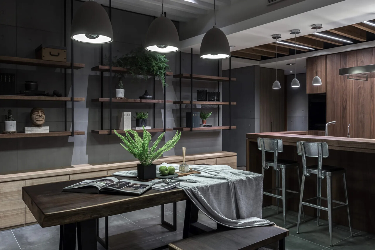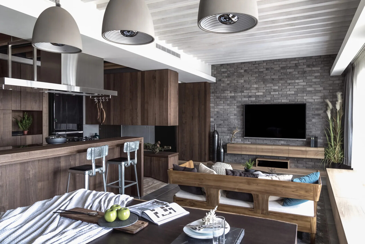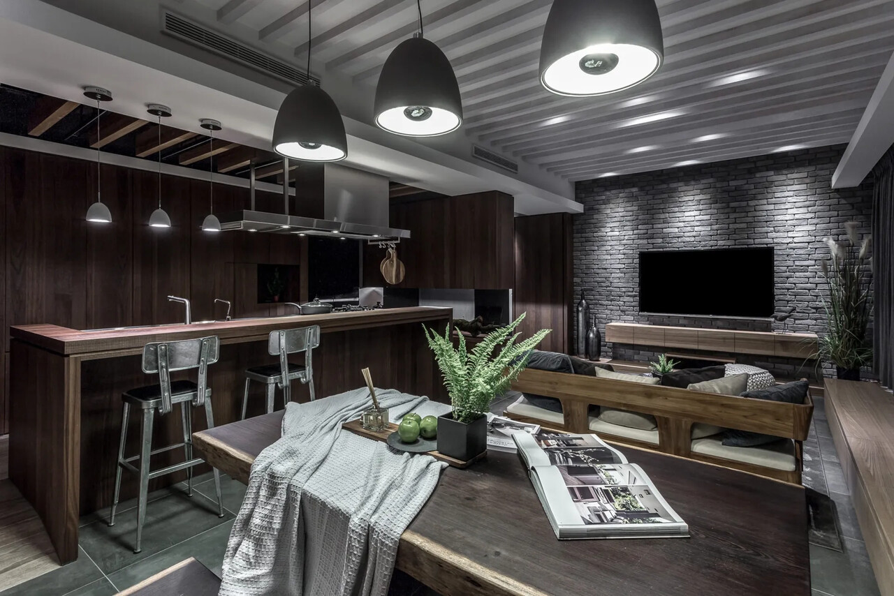 客廳、餐廳與中島吧台群聚一起,成為一個寬敞的聚會場所;