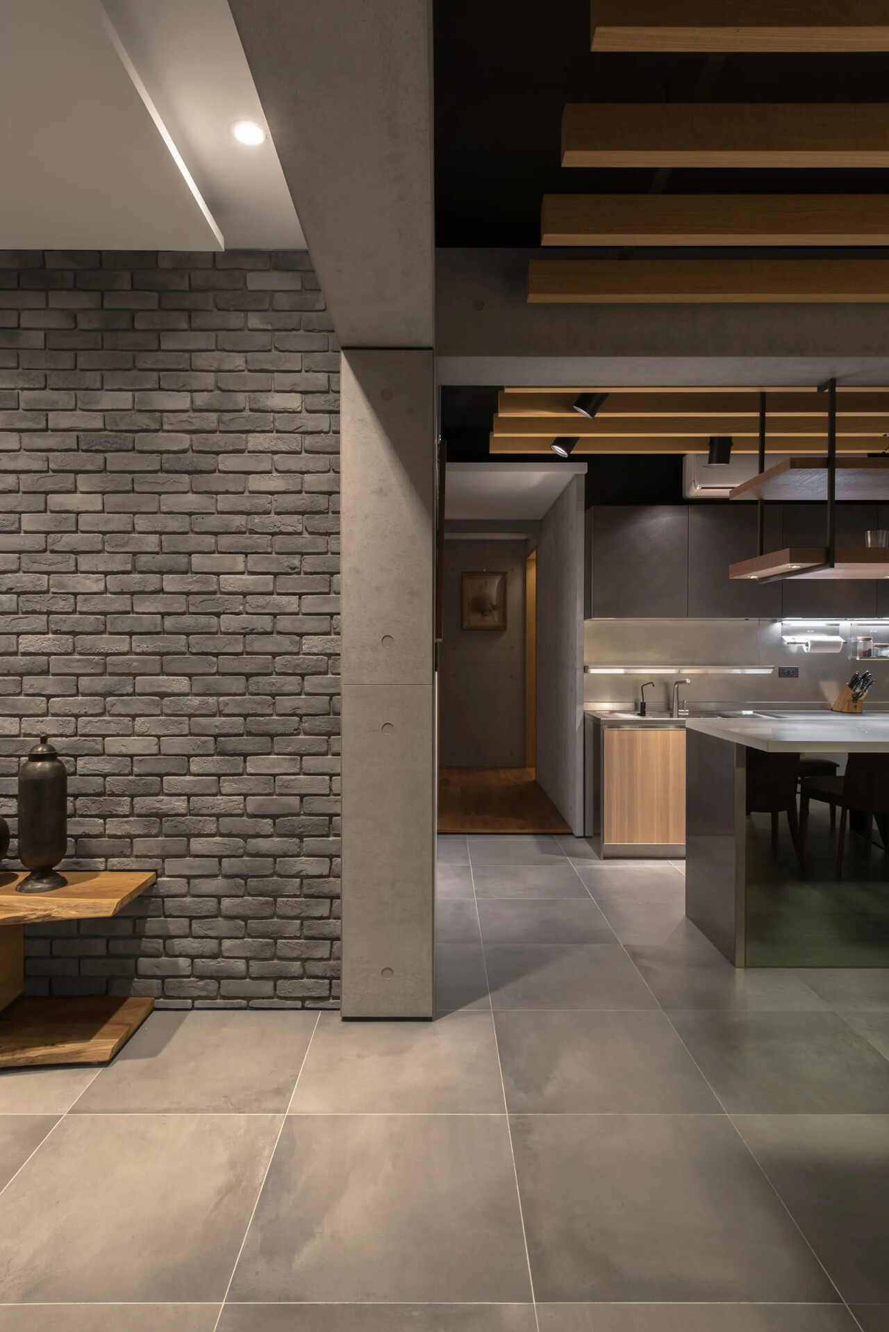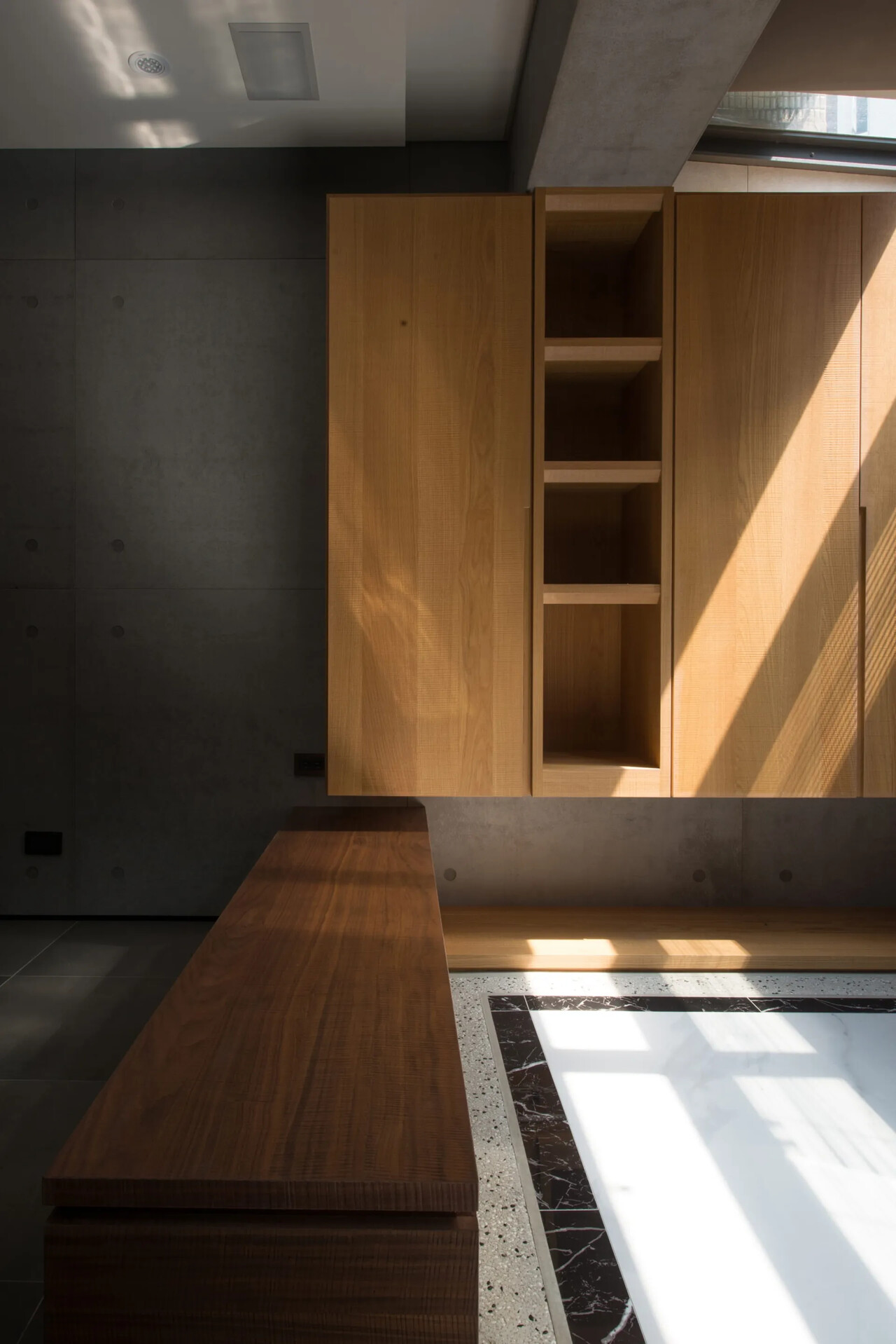最後在廚房邊界用天花板及地板的材質轉換,暗示公私領域的分野。