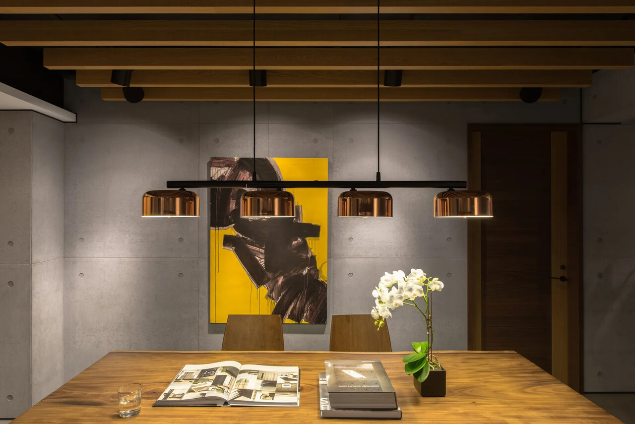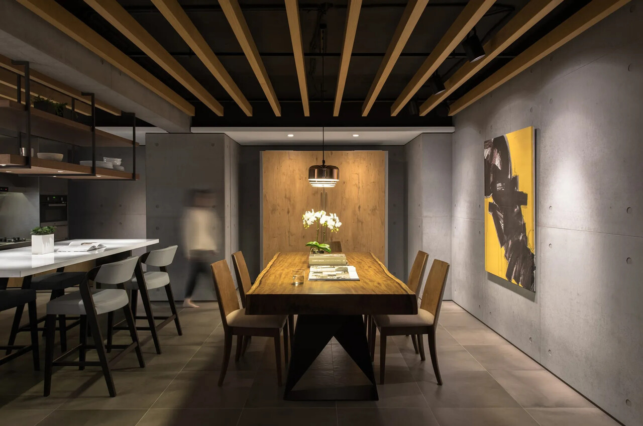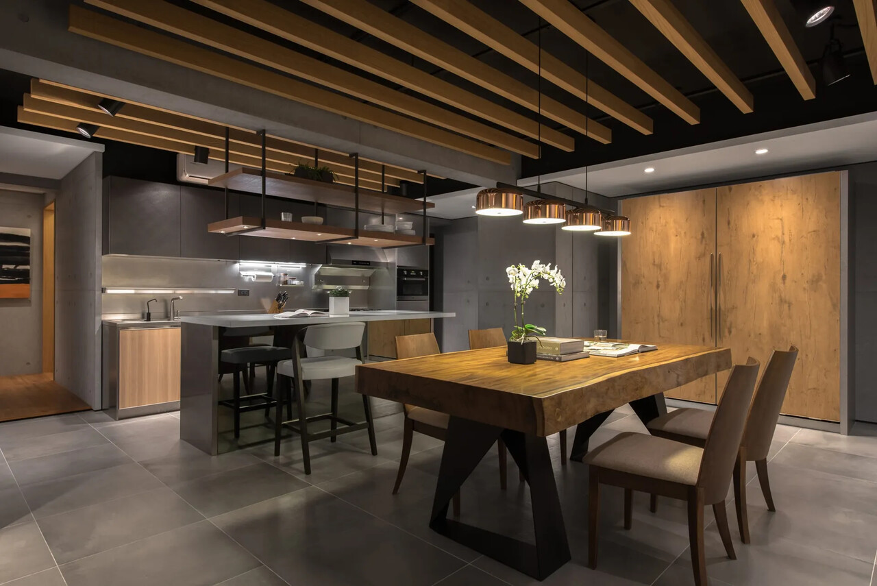 客餐廳以至廚房的公共領域串連放大成L型,餐桌比鄰客廳與中島而連接廚房,