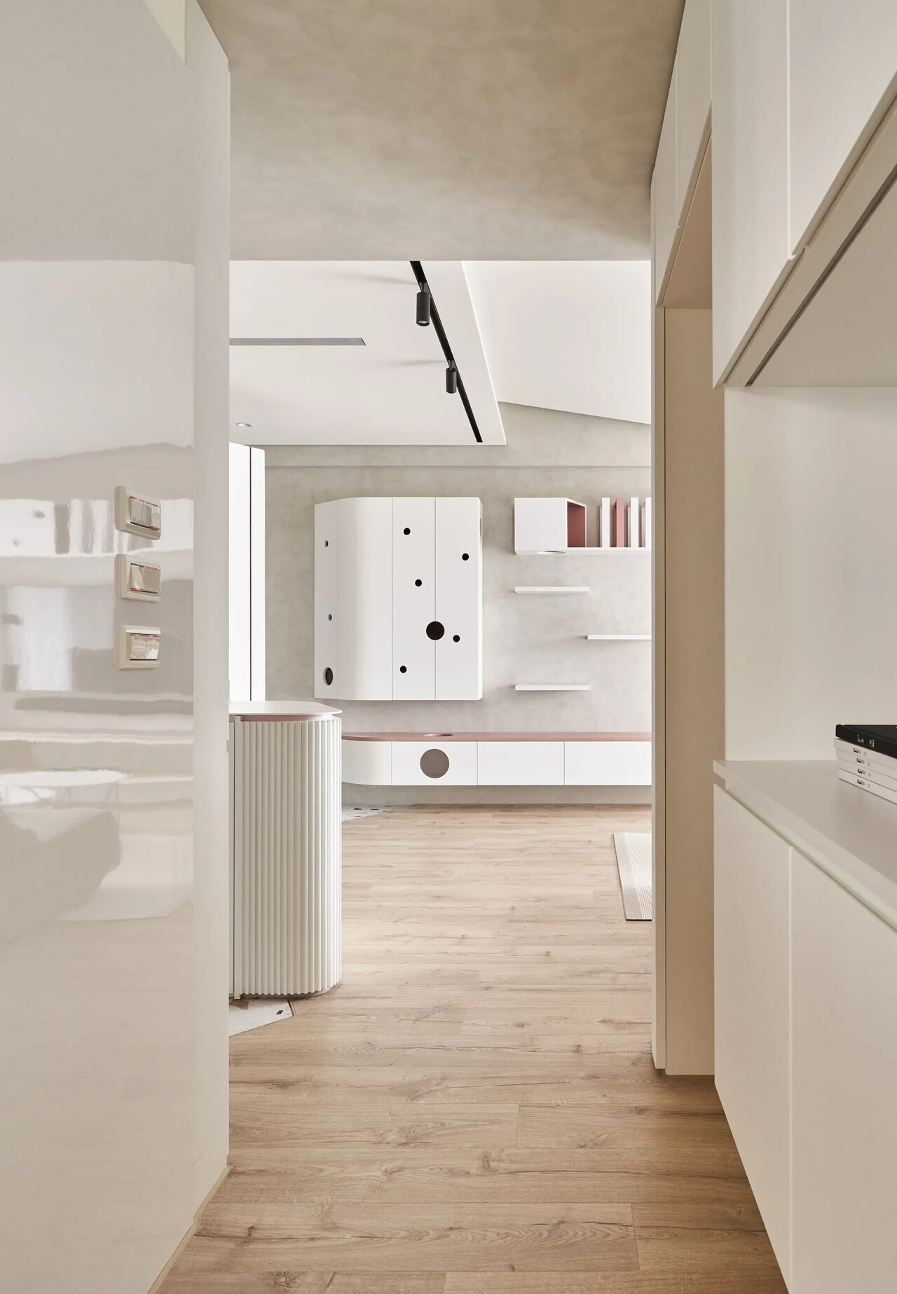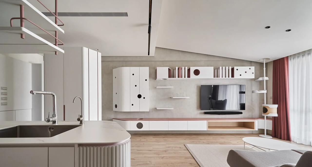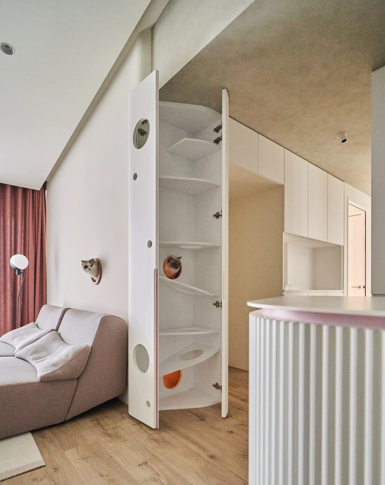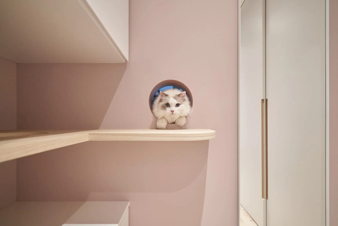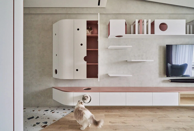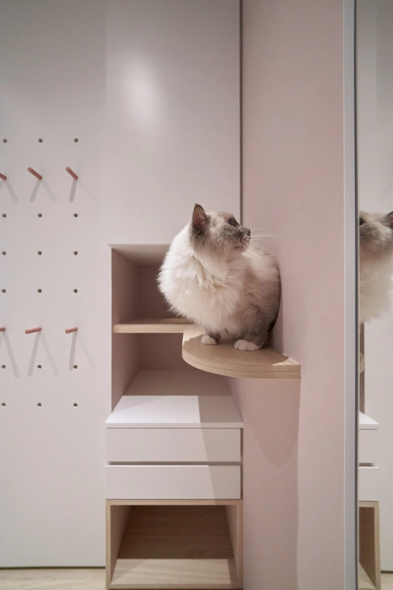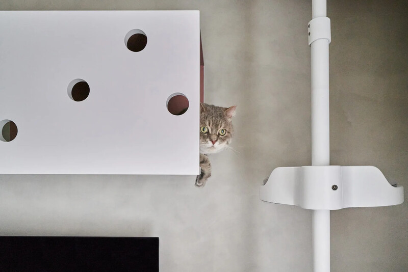 因此空間規劃以「貓」的視角和感受為設計主軸,代入屋主喜愛的顏色,將人與貓伴生共融的關係,體現在空間中,成為整個設計最重要的核心概念。從貓的觀點,除了客房及衛浴外,全室立體的貓動線、既密閉又具穿透的貓公寓,讓貓貓貓貓恣意在三維的虛實之間任意上下穿梭,以窺視孔代替櫥窗,提供自由也提供隱私,讓貓咪們更自在;從人的角度,以符合日常直覺的行為模式布