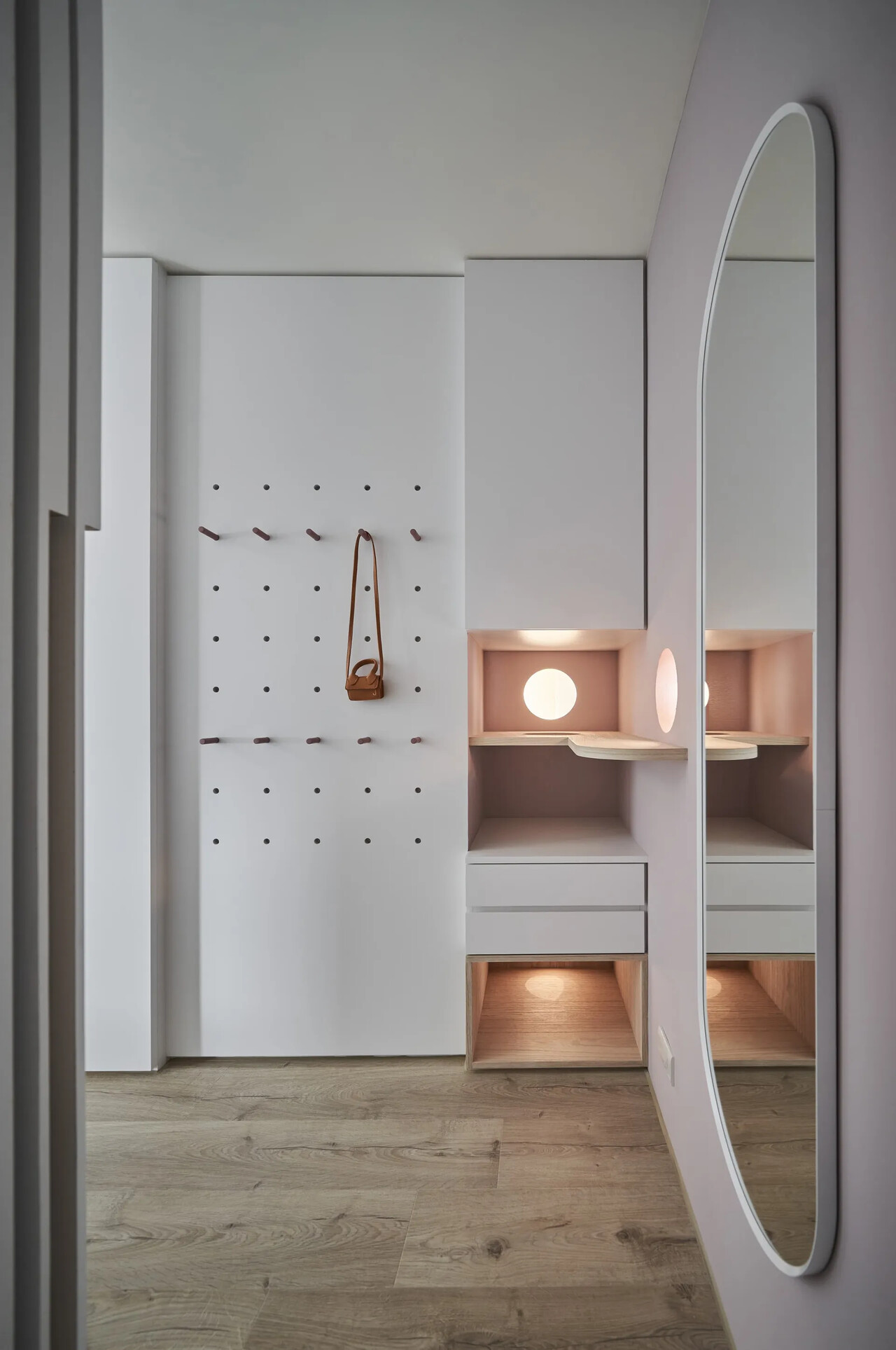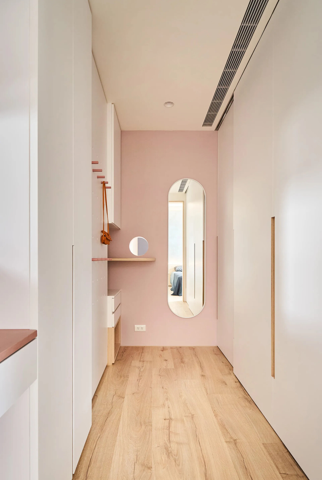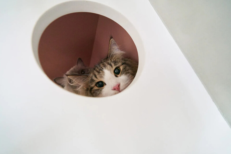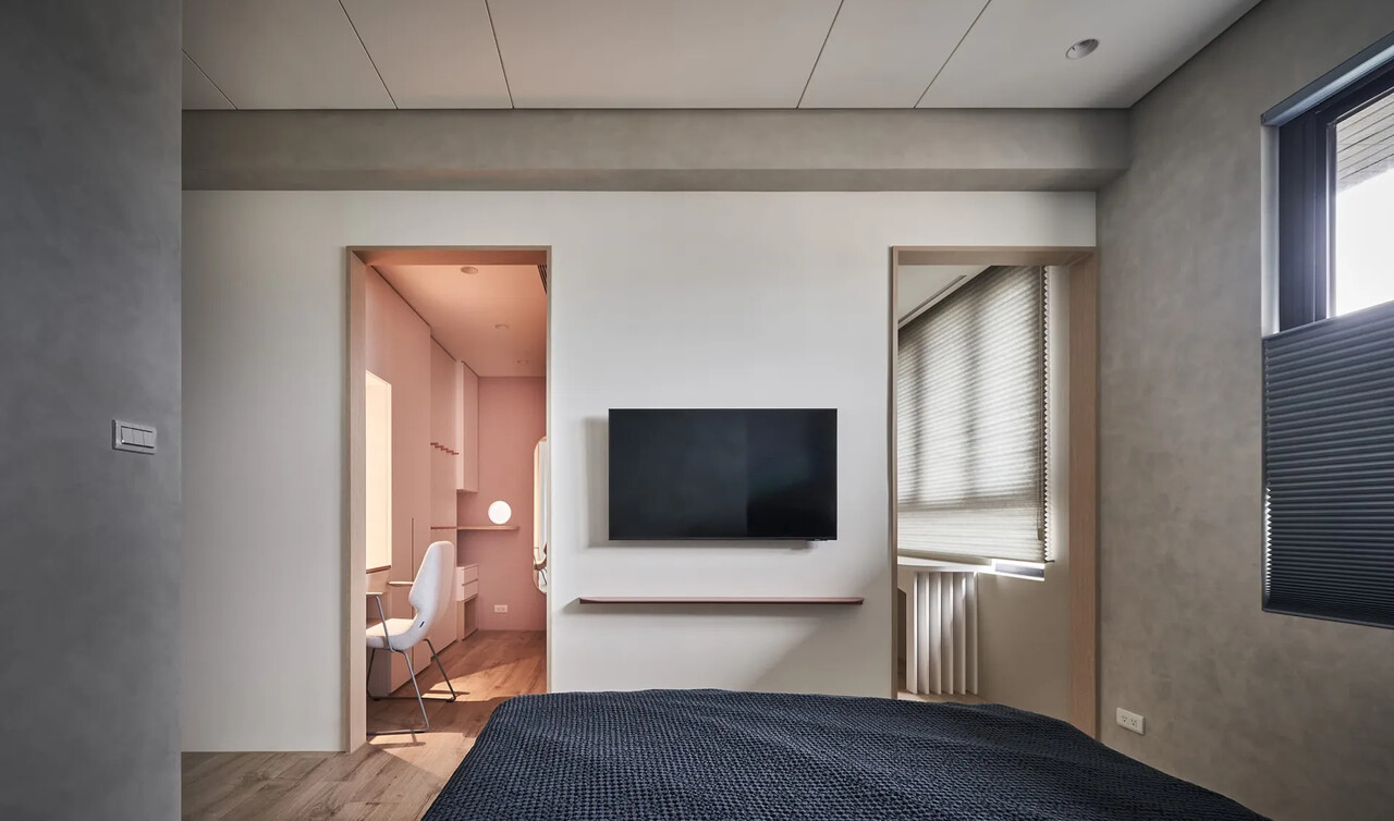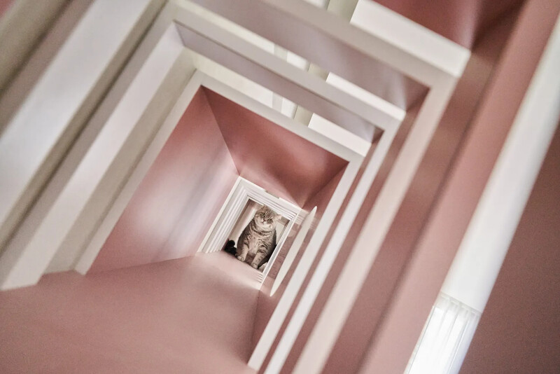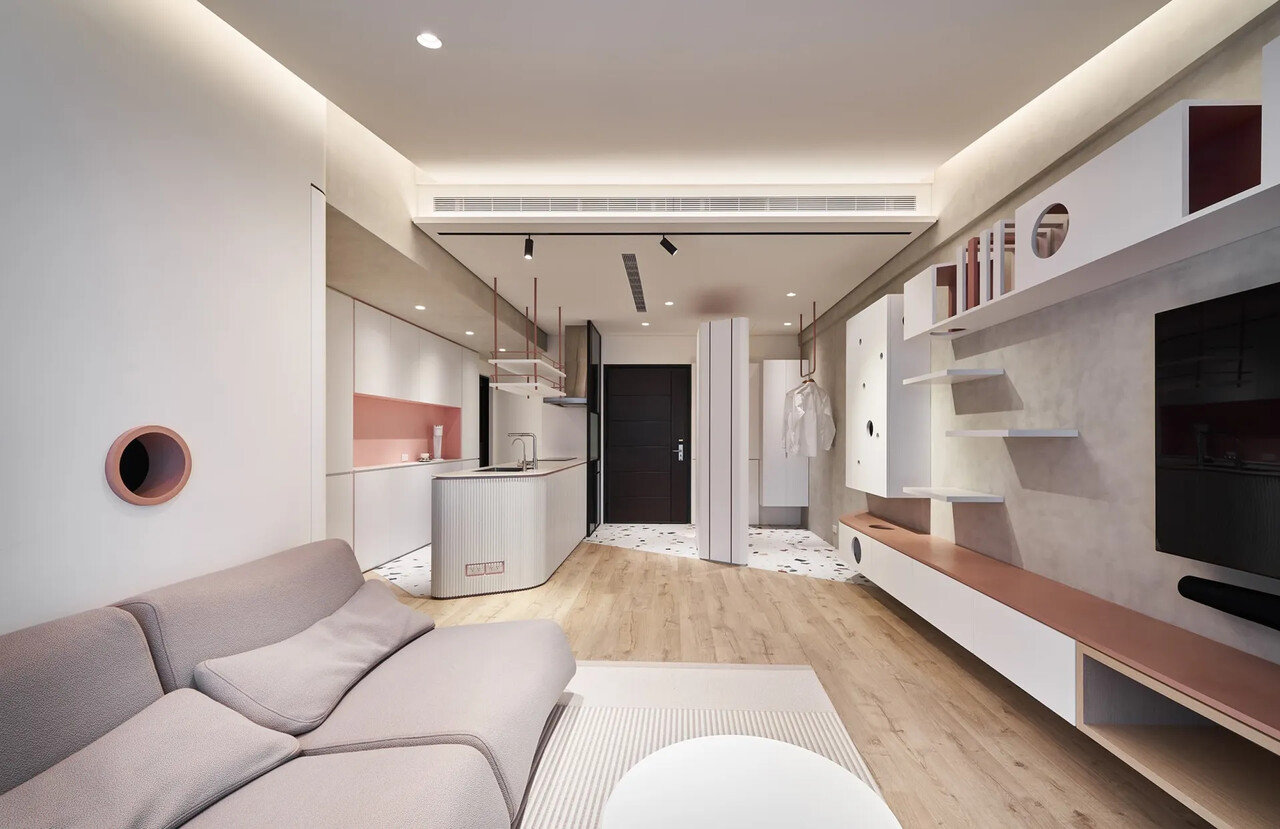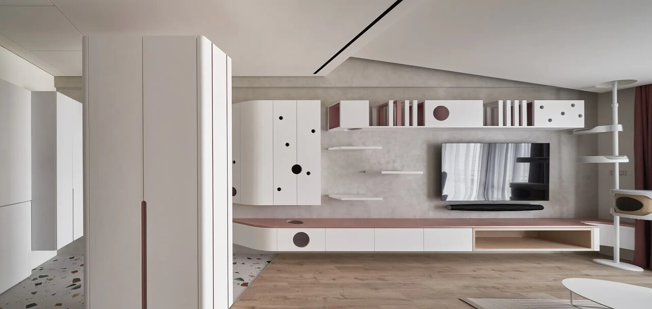 因此空間規劃以「貓」的視角和感受為設計主軸,代入屋主喜愛的顏色,將人與貓伴生共融的關係,體現在空間中,成為整個設計最重要的核心概念。從貓的觀點,除了客房及衛浴外,全室立體的貓動線、既密閉又具穿透的貓公寓,讓貓貓貓貓恣意在三維的虛實之間任意上下穿梭,以窺視孔代替櫥窗,提供自由也提供隱私,讓貓咪們更自在;從人的角度,以符合日常直覺的行為模式布