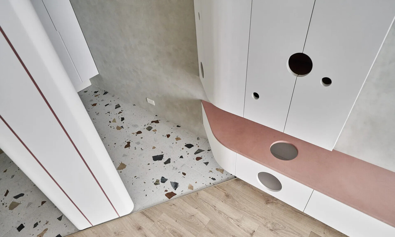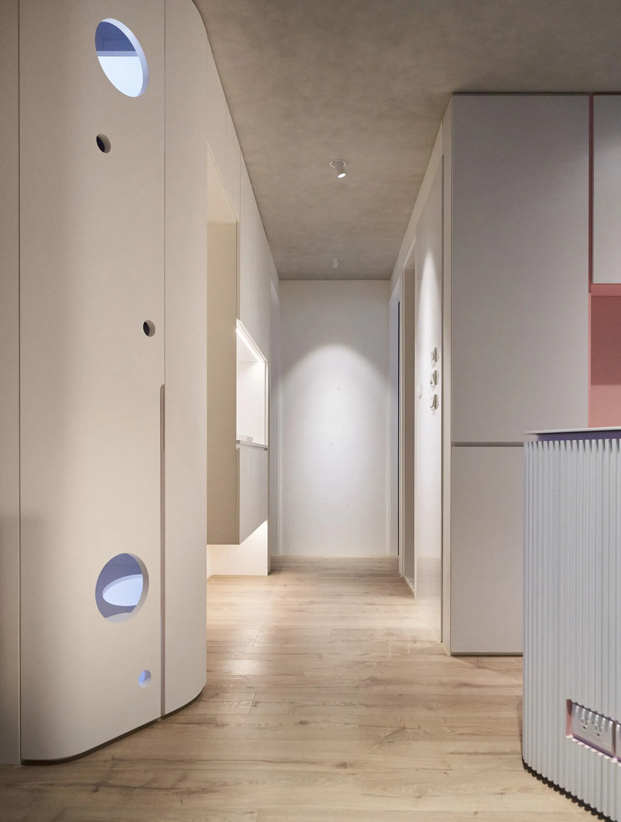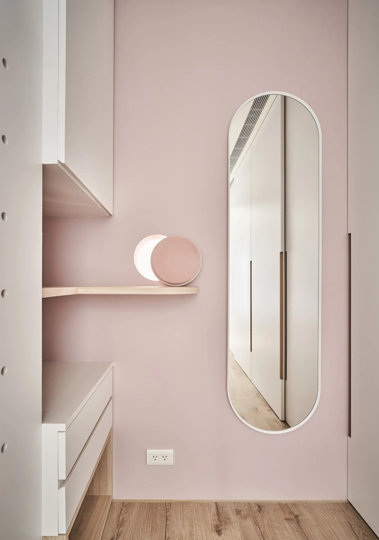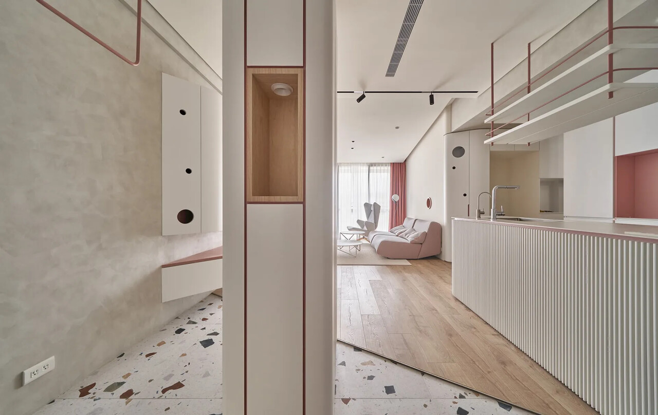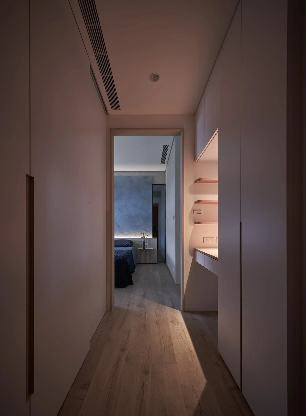 因此空間規劃以「貓」的視角和感受為設計主軸,代入屋主喜愛的顏色,將人與貓伴生共融的關係,體現在空間中,成為整個設計最重要的核心概念。從貓的觀點,除了客房及衛浴外,全室立體的貓動線、既密閉又具穿透的貓公寓,讓貓貓貓貓恣意在三維的虛實之間任意上下穿梭,以窺視孔代替櫥窗,提供自由也提供隱私,讓貓咪們更自在;從人的角度,以符合日常直覺的行為模式布