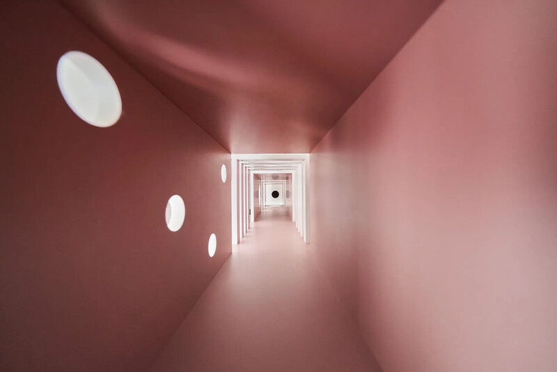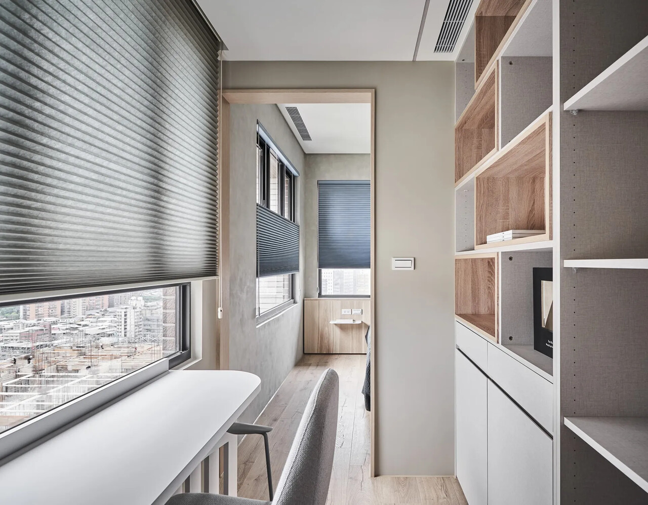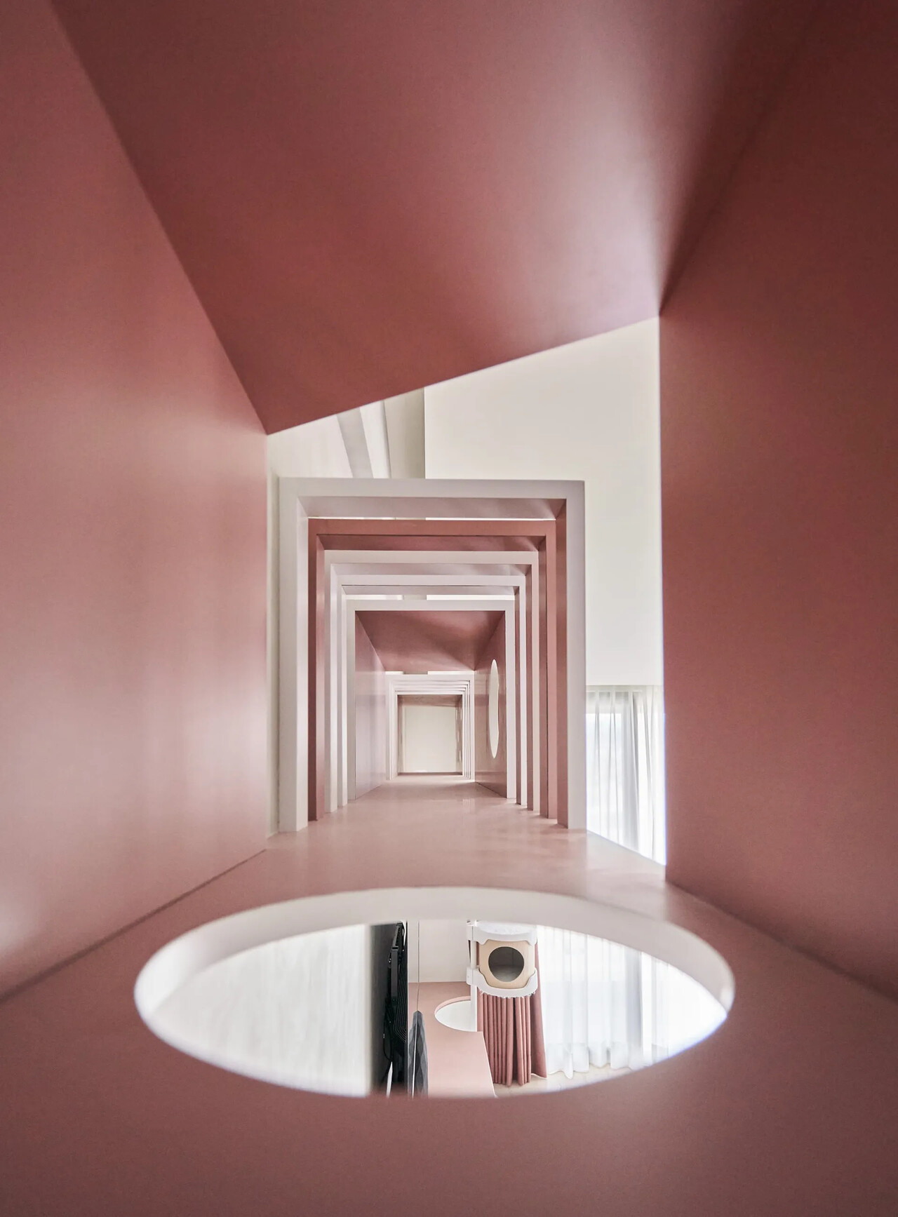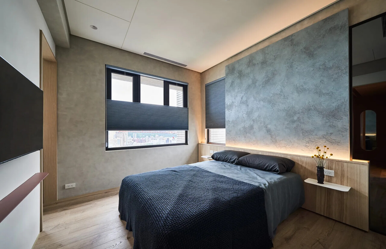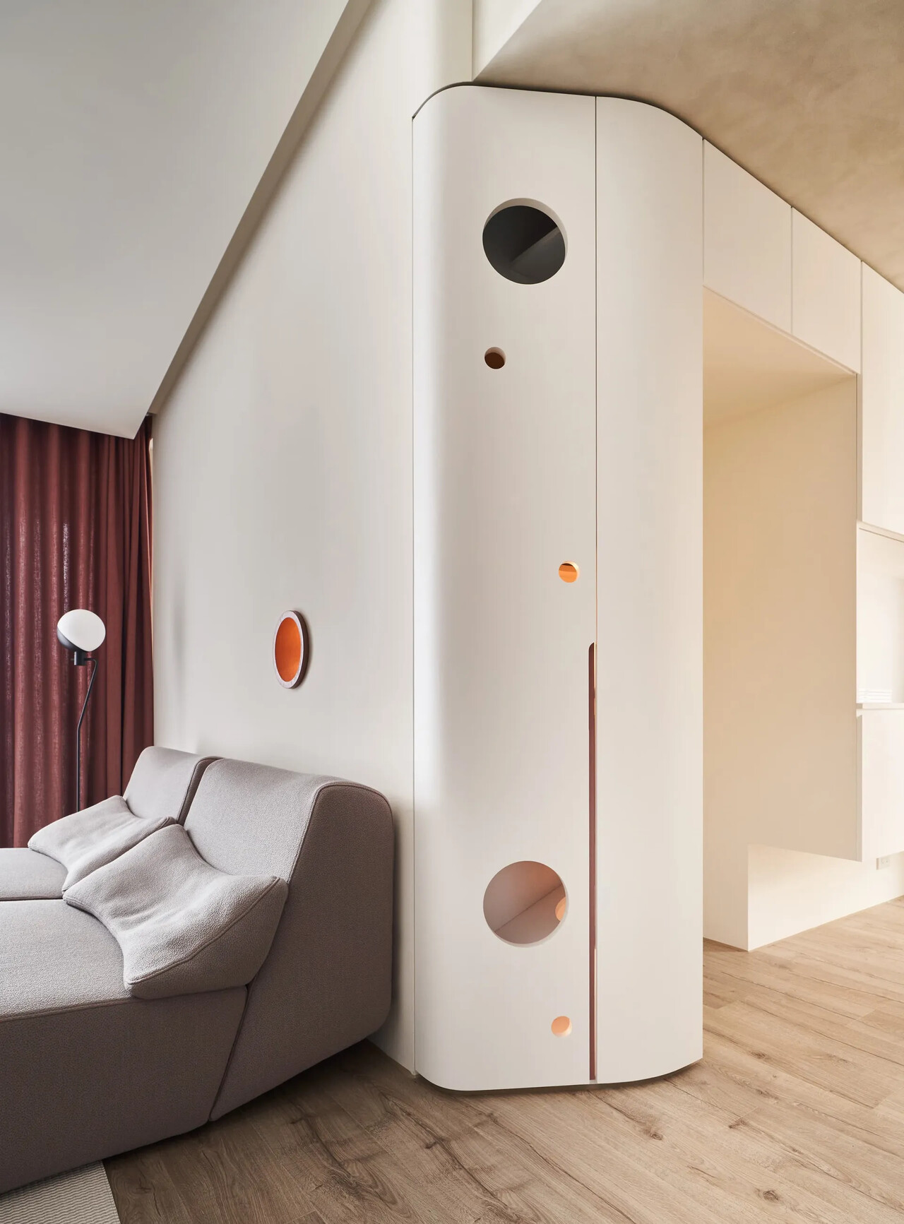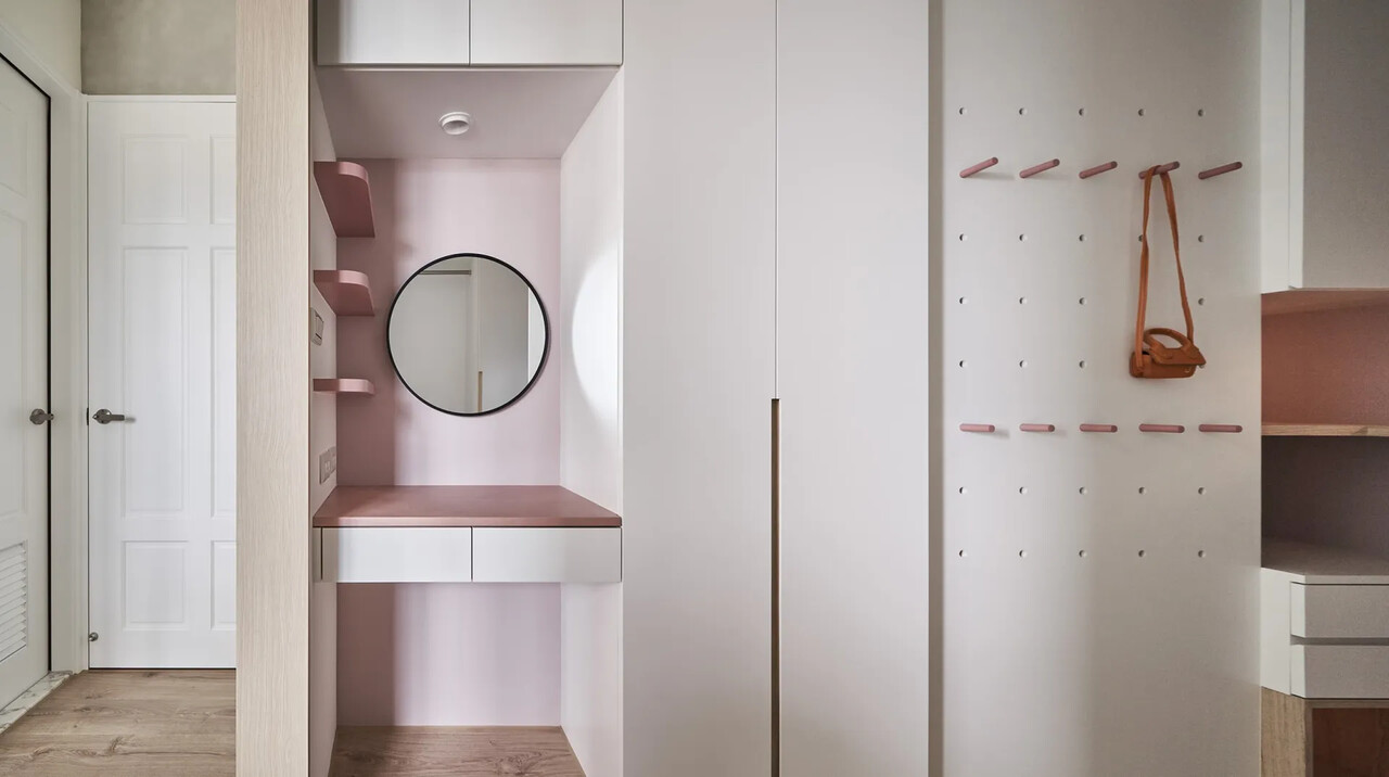 因此空間規劃以「貓」的視角和感受為設計主軸,代入屋主喜愛的顏色,將人與貓伴生共融的關係,體現在空間中,成為整個設計最重要的核心概念。從貓的觀點,除了客房及衛浴外,全室立體的貓動線、既密閉又具穿透的貓公寓,讓貓貓貓貓恣意在三維的虛實之間任意上下穿梭,以窺視孔代替櫥窗,提供自由也提供隱私,讓貓咪們更自在;從人的角度,以符合日常直覺的行為模式布