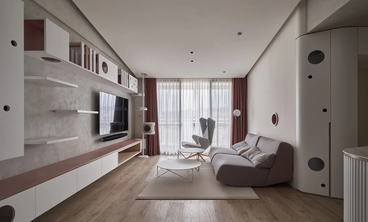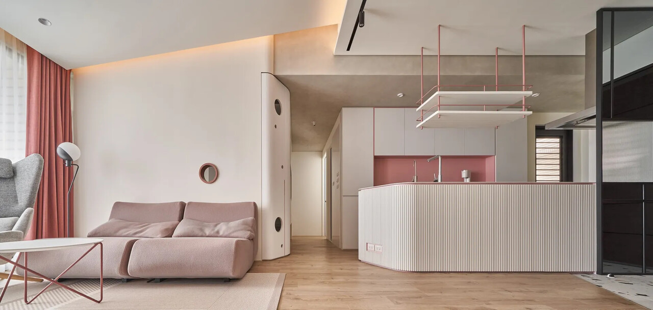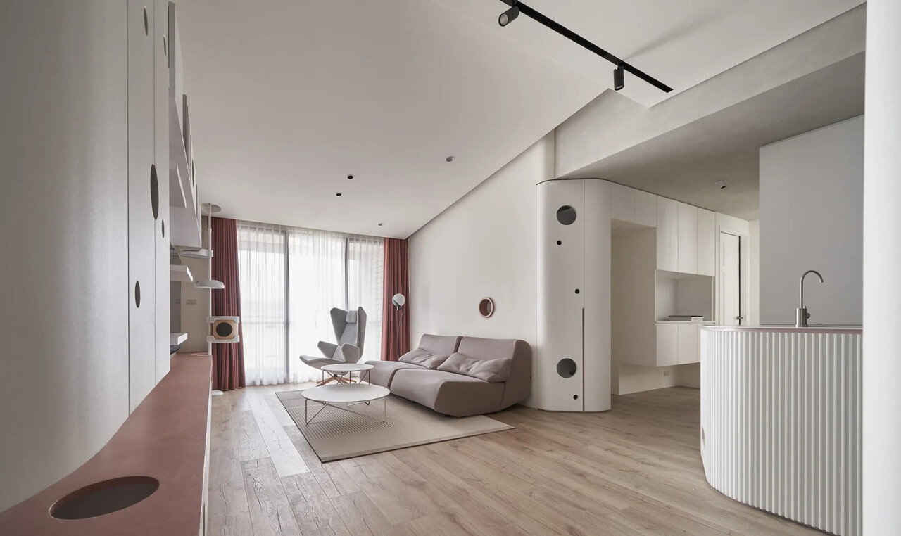局空間,將貓身運動的液態性,轉化在空間動線以及似流水的弧形量體上,並結合與異材質的銜接,隱性界定空間場域,達到人貓各自慵懶獨立而又關愛彼此自在共生的真自由樂園。