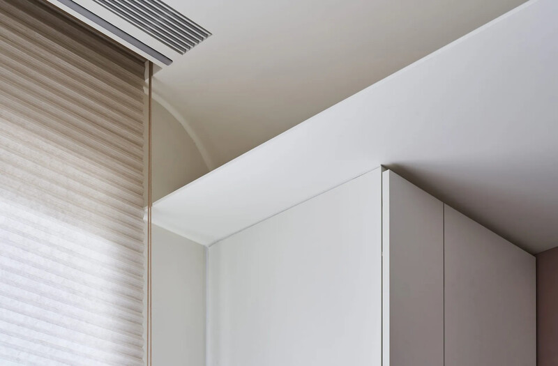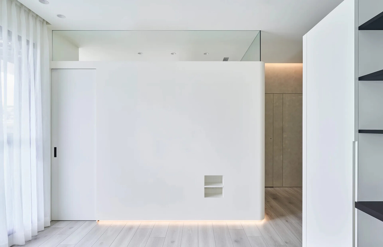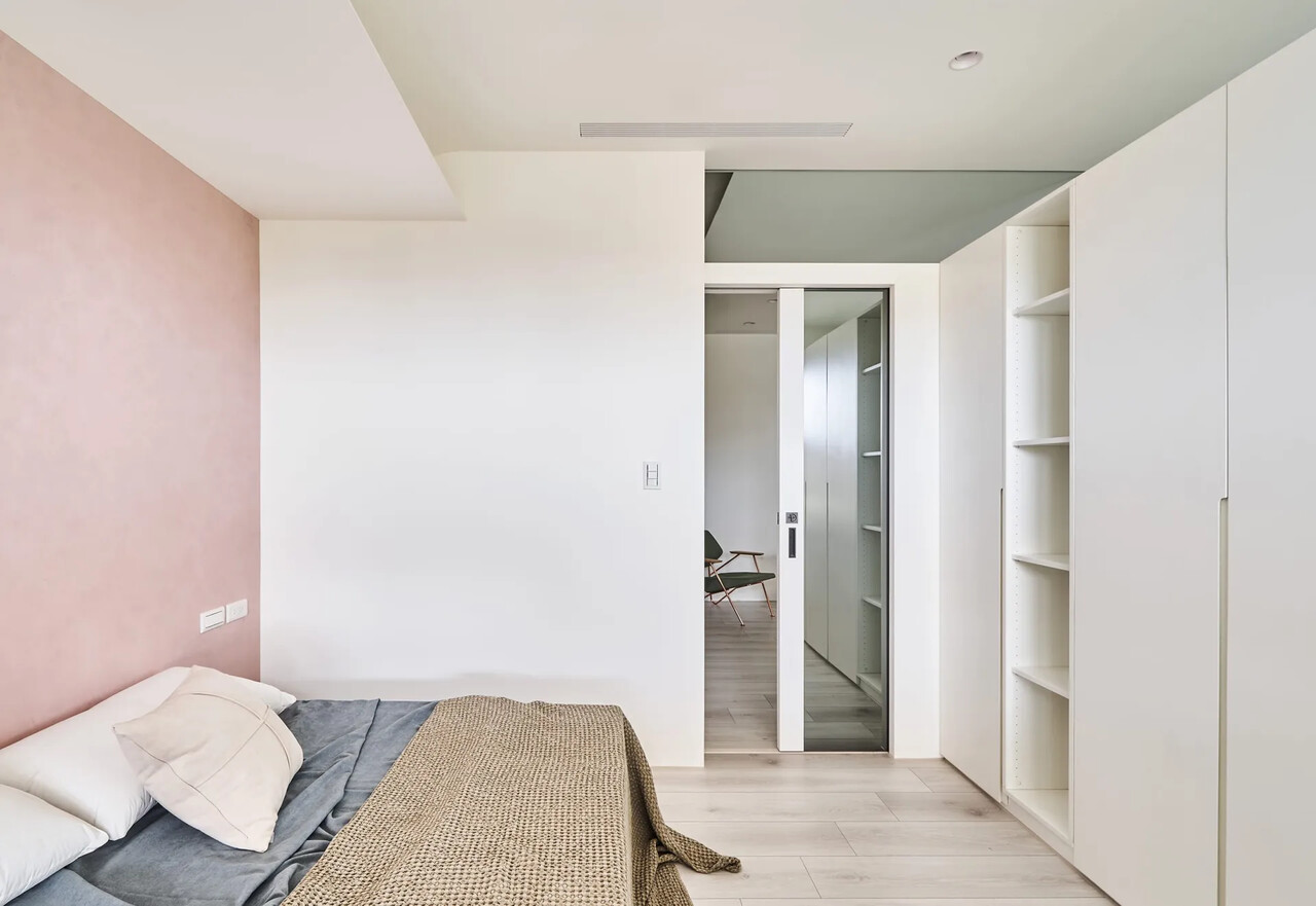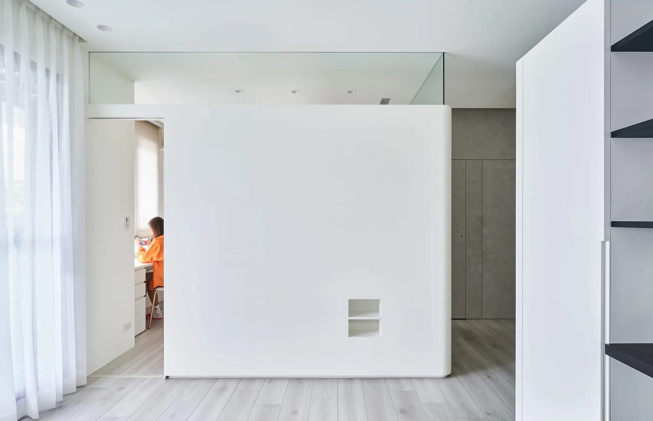 地延伸;隔間與櫃體不到頂,讓自然光與空氣無礙地穿梭流動,提高空間感受舒適性並放大視覺坪數。最後帶入屋主過往列國的遊歷與人生累積的收藏,裝飾素淨的空間,形塑專屬無二的空間個性。