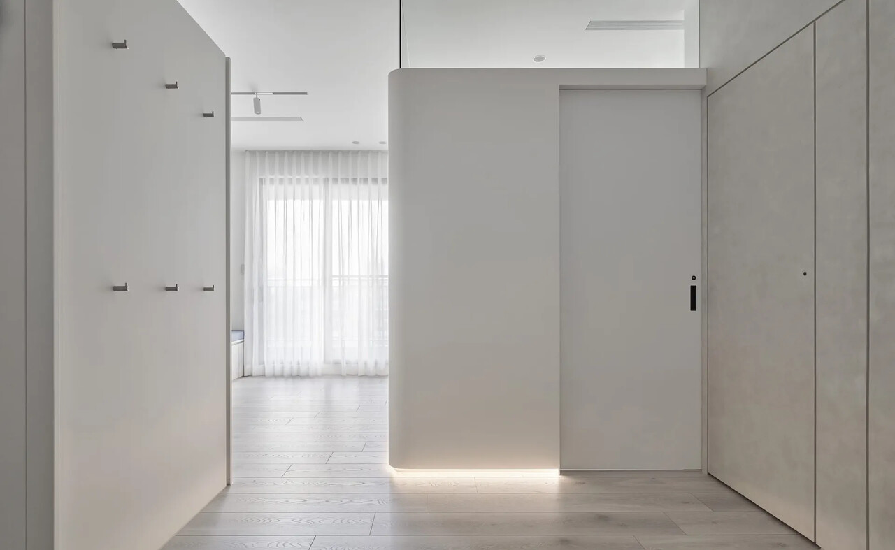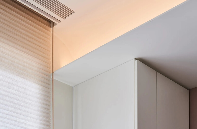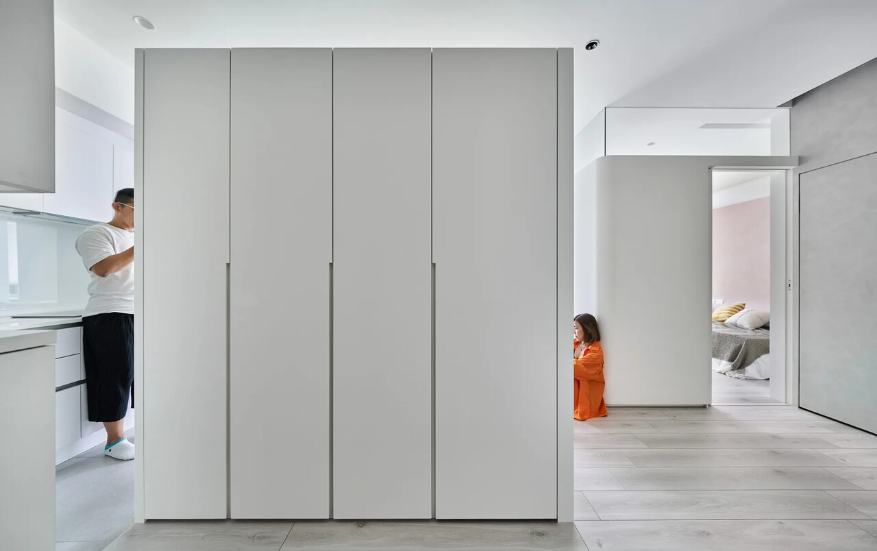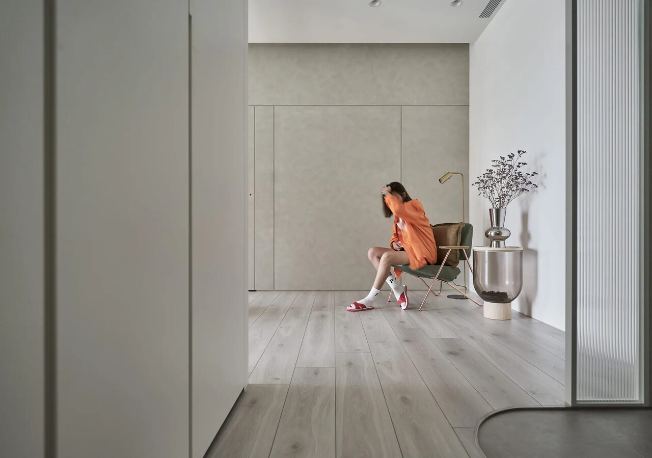 地延伸;隔間與櫃體不到頂,讓自然光與空氣無礙地穿梭流動,提高空間感受舒適性並放大視覺坪數。最後帶入屋主過往列國的遊歷與人生累積的收藏,裝飾素淨的空間,形塑專屬無二的空間個性。