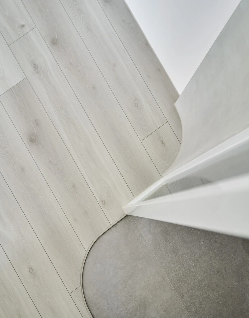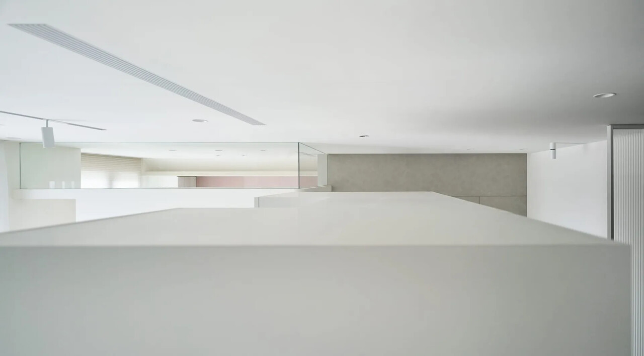 在有限的空間中,利用雙回字型動線,將空間視覺軸線延伸到最大,放大空間感的同時,創造空間複數使用與分區的可能性。